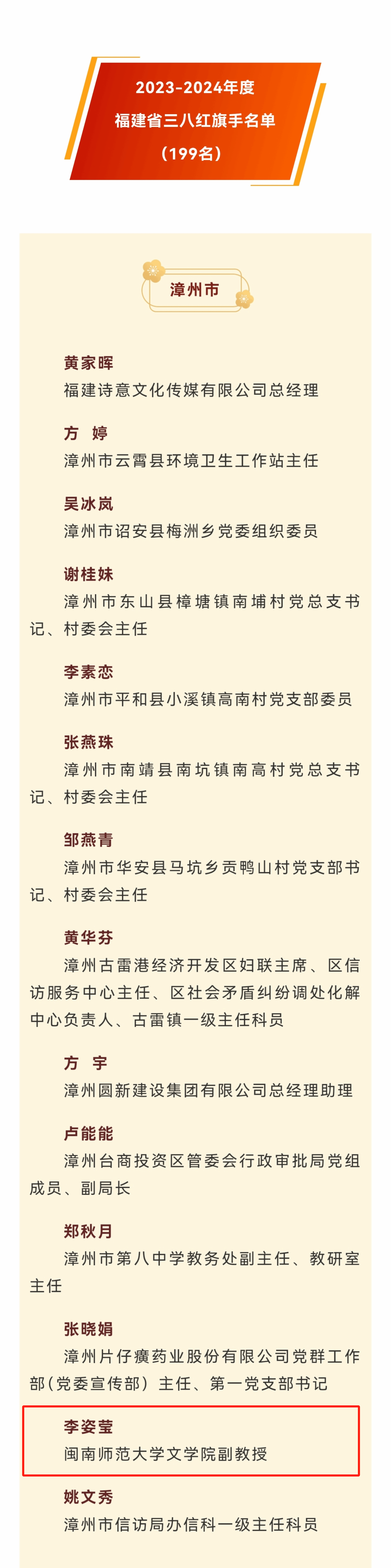 为表彰先进、树立榜样,进一步引领和激励广大妇女坚定不移听党话、跟党奋进新征程,近日,福建省妇联公布2023-2024年度福建省三八红旗手标兵、福建省三八红旗手、福建省三八红旗集体、福建省巾帼文明岗全名单。