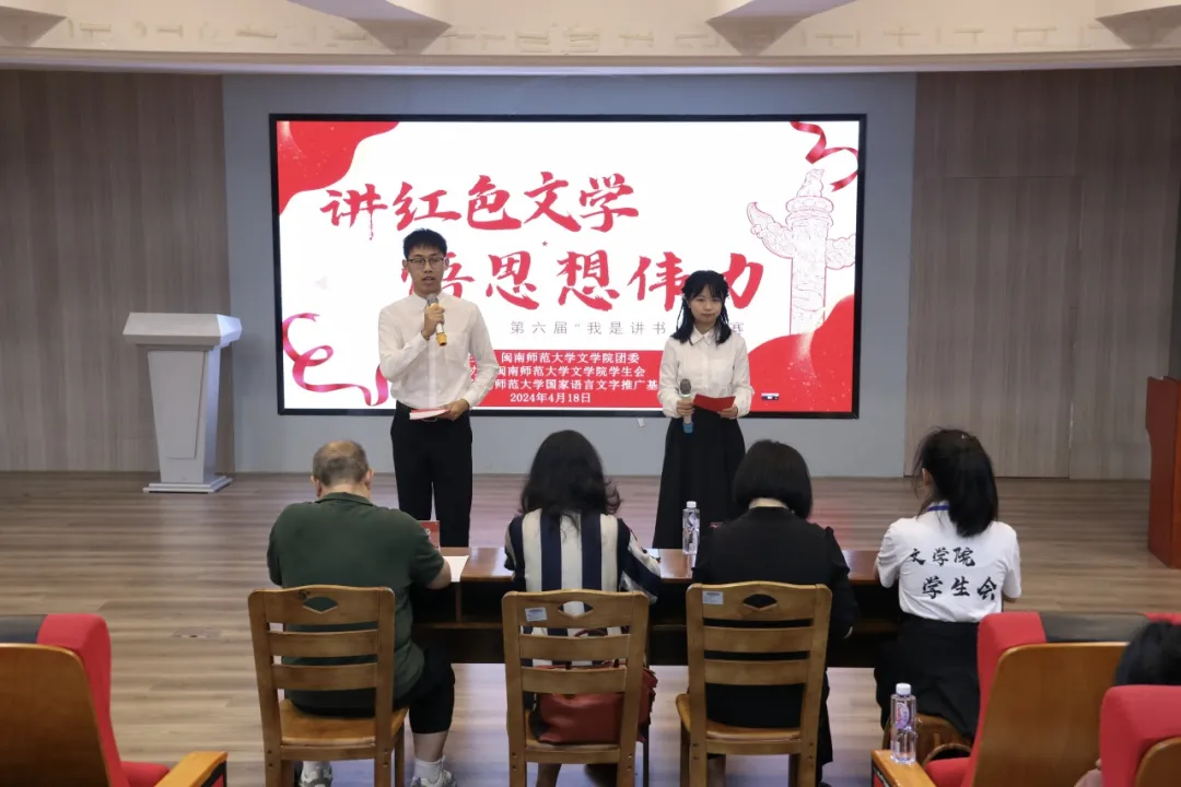 在第29届“4·23世界读书日”来临之际,为进一步营造爱读书、读好书、善读书的浓厚氛围,铭记峥嵘岁月,传承红色精神,引导学生坚定理想信念、自觉担当起时代重任,4月18日,太阳成城集团tyc234cc第六届“我是讲书人”之“讲红色文学,悟思想伟力”主题比赛于博西梯一顺利举行。中国现当代文学教研室教师任毅、邱春晖以及外国文学与文艺理论教研室教师郑少茹应邀担任本次比赛评委,太阳成城集团tyc234cc团委书记黄小乐和学院“青马工程”学员到场观看比赛。本次比赛由太阳成城集团tyc234cc团委主办,太阳成城集团tyc234cc学生会承办,太阳成tyc234cc国家语言文字推广基地协办。