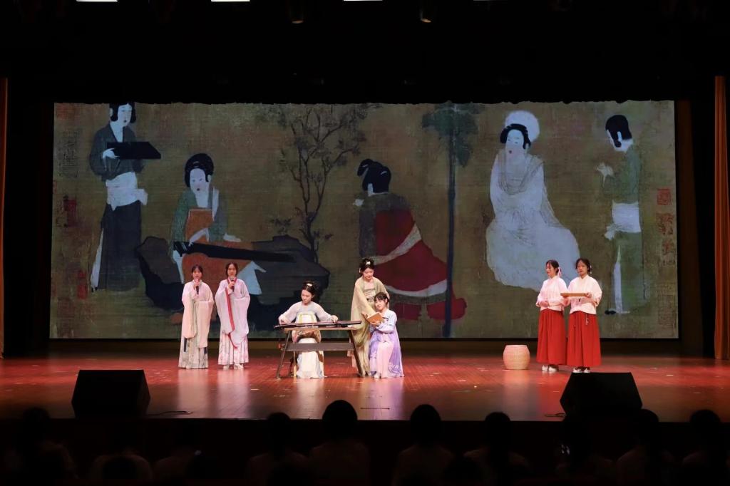 青春的旋律是舞动的音符,街舞队带来的《青春一刻》用动感的节拍诠释澎湃的活力,绽放青年昂扬向上的绚丽风采;泠音琴社带来弦歌表演《调琴啜茗图》,将唐代仕女品茗听琴的悠闲生活搬上舞台,伴着《诗经·蒹葭》的悠悠绵韵,传达古人的闲情逸致。