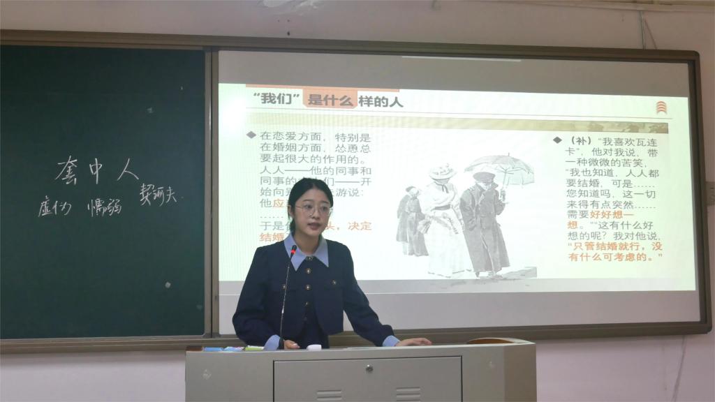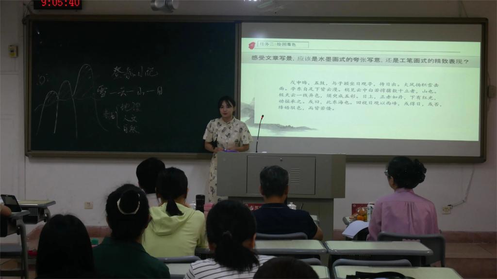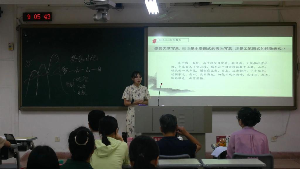 此次比赛选手可自行选择参赛篇目,进行教案撰写与课件制作,决赛当日按照教学设计进行十分钟现场片段教学。选手们积极备赛,片段教学中情境选取独特、板书设计新颖、教学语言规范,皆给大家留下深刻印象。陈小燕由景到情设计《登泰山记》的教学,采用明信片制作的形式,通过为明信片选景、构图和上色,将泰山日出之景与作者情感的分析巧妙结合。陆飘飘在《沁园春•长沙》的教学中,通过炼字的方式分析词的意象,带领学生领略词人笔下橘子洲头的壮阔美、色彩美和伟人慷慨激昂的心绪。黄逸逍精准把握教学目标,在对《在马克思墓前的讲话》一文的讲解中,通过课文与讲话草稿的对比联读,聚焦语言特点的分析,带领学生解读演讲对象、场合和目的等内容,感受马克思的伟大人格。选手们娴熟驾驭课堂教学,精美的课件、大方的教态、流畅的语言均展现出扎实的教学基本功。