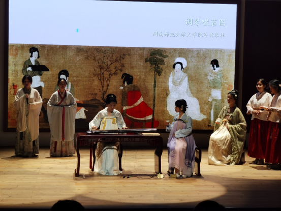 演出舞台上,泠音琴社圆满完成《调琴啜茗图》弦歌情景剧的表演。《调琴啜茗图》是唐代画家周昉的杰作,这幅画工笔重彩地描绘了唐代仕女品茗听琴的悠闲生活。古人茶事,总伴着风雅。而《蒹葭》所营造的空灵意境与盛唐贵族妇女的闲适情调相得益彰。泠音琴社的七名社员参与此次表演,她们在剧中分别饰演品茗听琴的贵妇、调琴奏乐的弹琴者、咏歌助兴的歌姬、端茶倒水的侍女。琴社在还原此画情景的基础上,为诗经中的经典作品《蒹葭》谱写新调,舒缓悠扬的歌声与清澈明净的琴声融为一体,使人心静如水,陶醉其中。