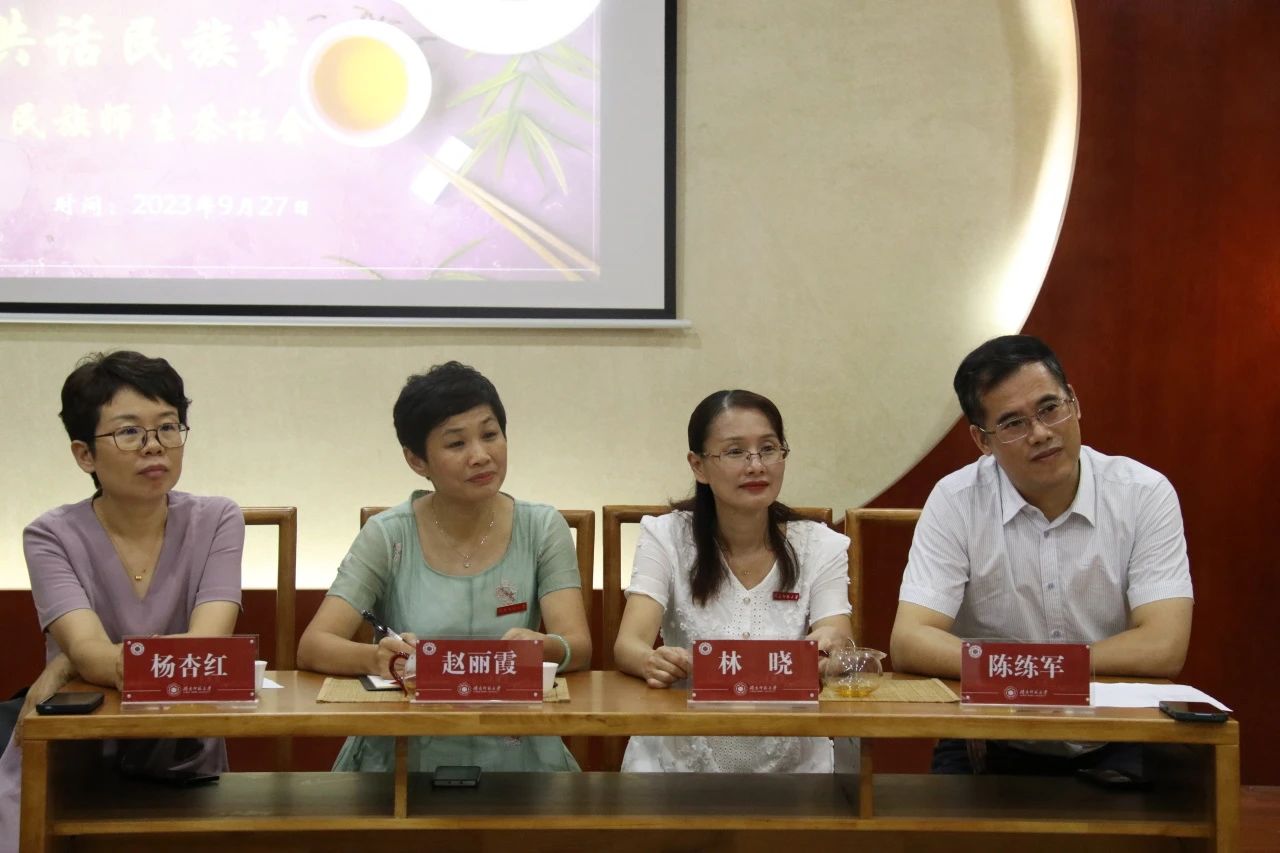 为持续深入学习贯彻党的二十大精神,进一步传承、弘扬中华民族文化,加强与少数民族及港澳台学生的沟通和交流,促进民族团结进步,铸牢中华民族共同体意识,9月26日晚,太阳成城集团tyc234cc于海峡两岸茶文化课堂召开2023级新生少数民族及港澳台师生茶话会。学院党委书记赵丽霞、副院长杨杏红、陈练军,团委书记黄小乐、23级新生辅导员杨书涵、姚震、23级少数民族及港澳台学生代表到场参加,本次茶话会由太阳成城集团tyc234cc党委副书记林晓主持。