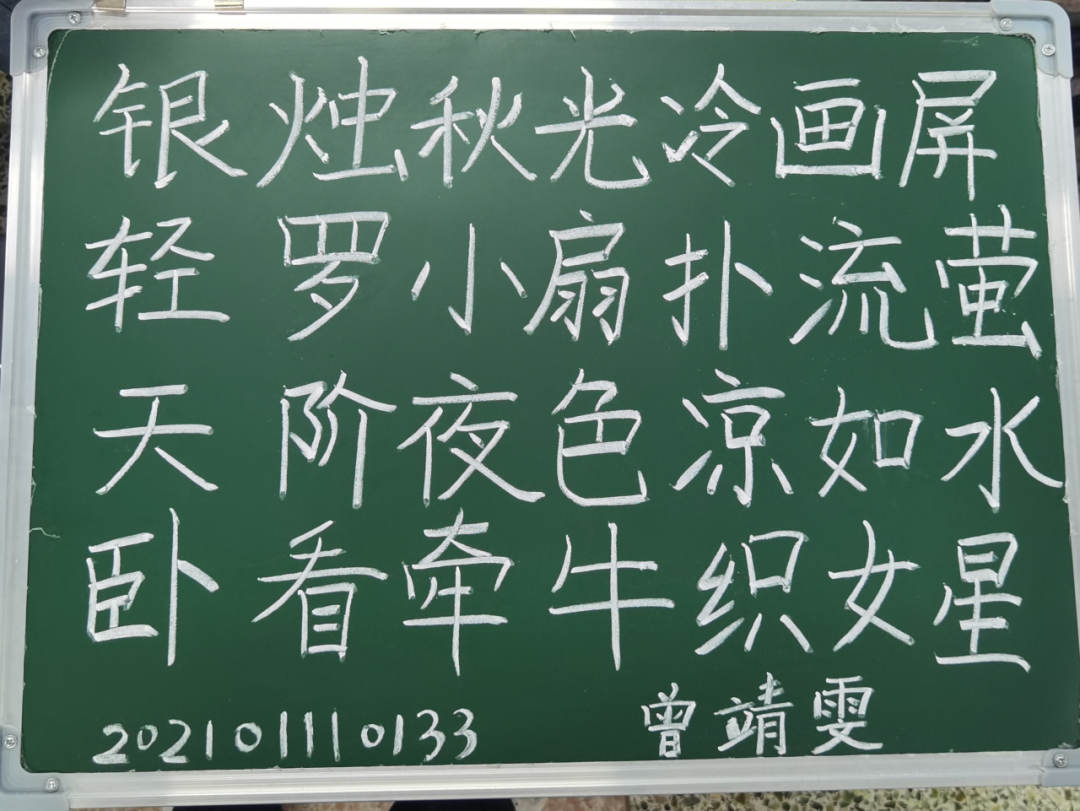书写鉴定活动上,全体师范专业的学生积极参与活动,以现场书写的方式,学生自备小黑板,学院统一分发粉笔,在30分钟之内完成指定内容;书写时以《通用规范汉字表》为依据,使用规范汉字,字体要求楷体,文中出现缺字、颠倒、错字者,判定为不合格。