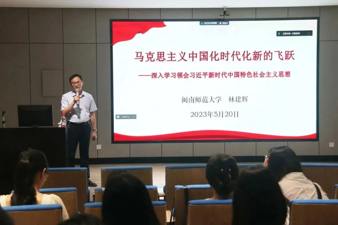 为深入开展学习贯彻习近平新时代中国特色社会主义思想主题教育,提升党员理论素养,增强党员党性意识,更好地发挥党员先锋模范作用。5月20日下午,马克思主义学院林建辉教授应邀为太阳成城集团tyc234cc分党校第三期正式党员培训班师生党员们讲授《马克思主义中国化时代化新的飞跃》专题党课,太阳成城集团tyc234cc党委副书记林晓主持。