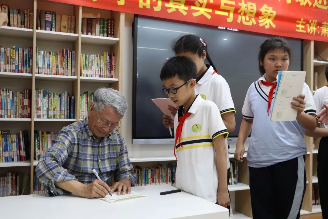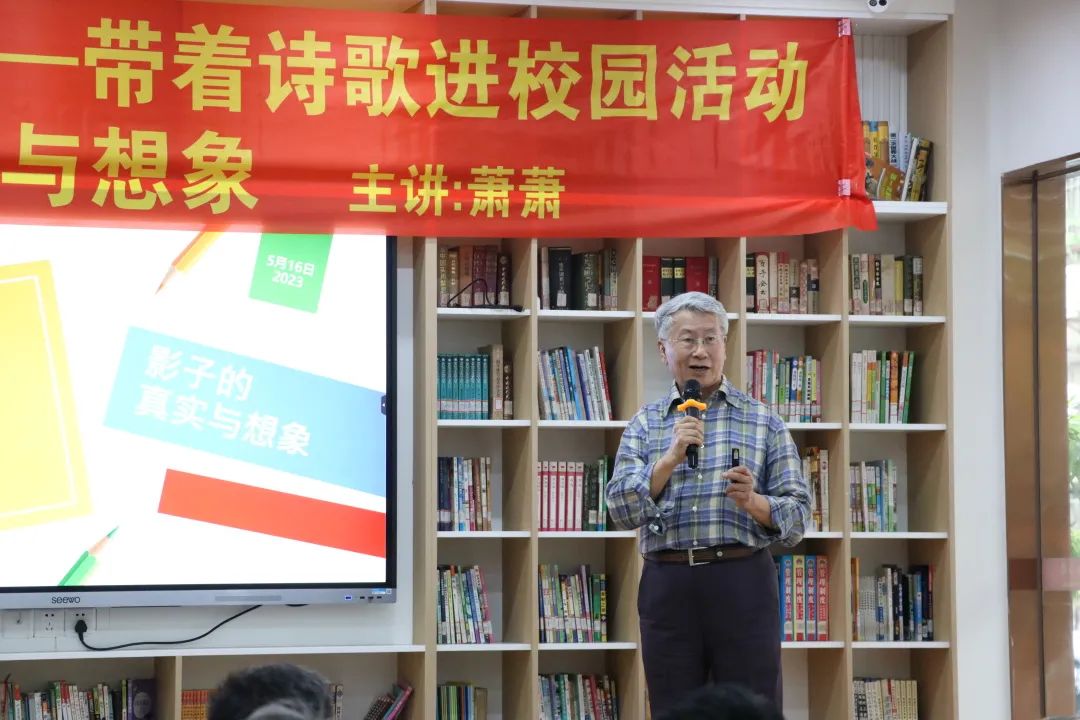 活动中,萧萧在芗城实小主持举办诗歌学术沙龙,开展主题为“影子的真实与想象”的学术讲座。萧萧以《影子》为例,用质朴易懂的语言强调了以下几点:其一,写诗的意义在于将抽象转化为具体,需要懂得如何正确运用诗的形象;其二,写诗最重要的便是要掌握诗歌的音乐性,掌握譬喻等方法并灵活运用;其三,巧妙运用“加减乘除”“角色互换”的方法进行改写,创造出有创意的新诗。讲座结束后,同学们针对本次讲座进行提问,与在场老师热烈互动。萧萧也对本次讲座进行总结,他认为,诗不是单纯知识的累积,而是诗人对其所描写的对象的情谊的外露。诗是一种有真情经过锤炼的语言的艺术,生活里处处有诗,要善于发现生活中的美,才能写出好诗。