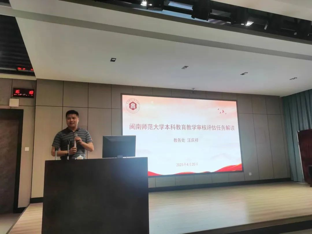 随后,教务处处长汪庆祥为我院教职工做了本科教育教学审核评估工作任务解读。汪庆祥回顾了上一轮审核评估的情况,深入分析了新一轮审核评估的特点:新一轮审核评估贯彻落实习近平总书记关于教育的重要论述和全国教育大会精神,全面对接新时代教育评价、教育督导体制机制改革要求,引导督促高校遵循高等教育规律和本科太阳集团规律,聚焦本科教育教学质量全面提升。以评促建、以评促改、以评促管、以评促强,促进学校内涵发展、特色发展、创新发展。并对审核评估工作方案的评估指标和主要工作任务做了详细解读。最后,汪庆祥提出:开展本科教育教学审核评估工作,是提升我校本科教育教学和太阳集团质量的重要契机。他号召学院全体教职工,以积极担当的精神状态,齐心协力推进迎评各项工作,以充分的准备迎接专家组的考察,有力推动我校本科教育教学工作再上新台阶。
