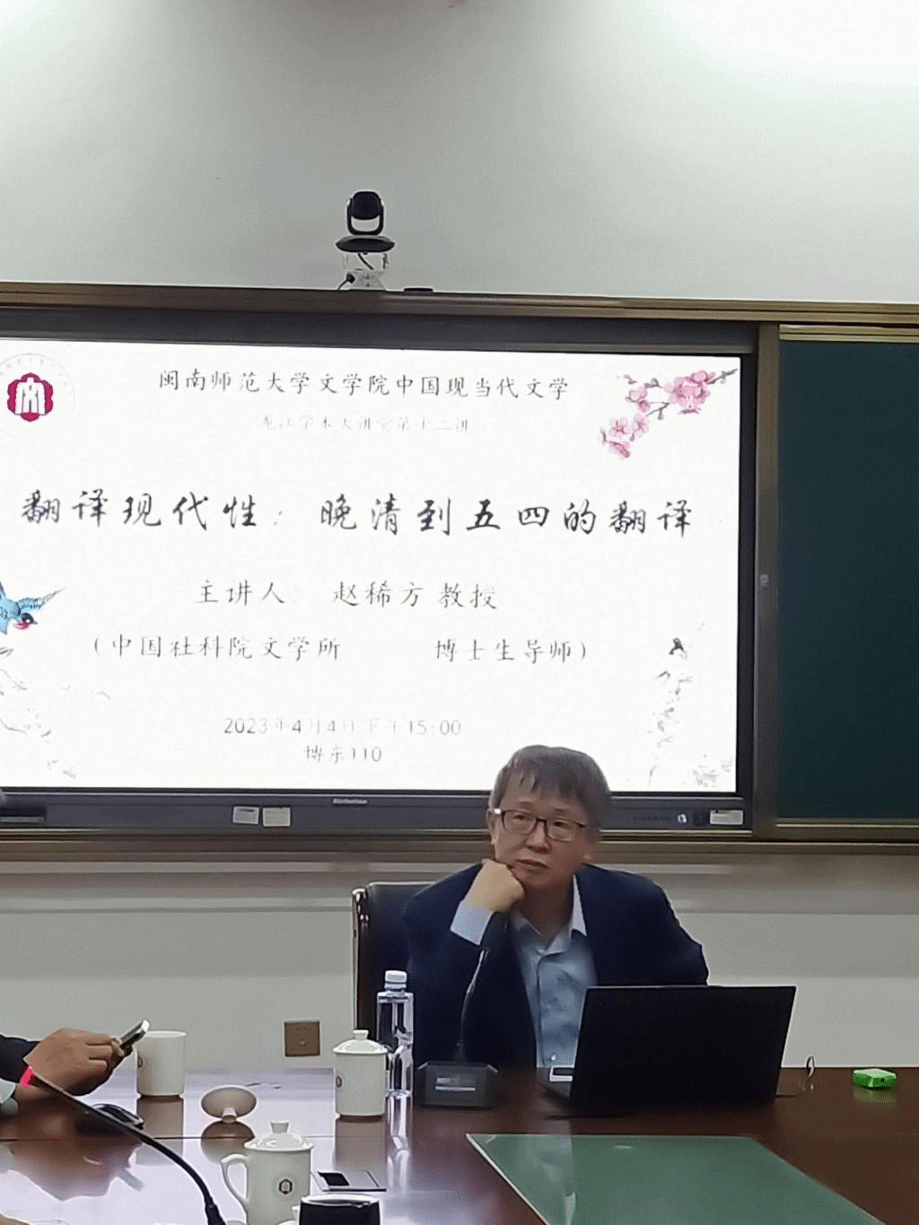 4月4日下午,太阳成城集团tyc234cc中国现当代文学“龙江学术大讲堂系列讲座”第十二讲“翻译现代性:晚清到五四的翻译”在博东110教室举行。本次讲座邀请到了中国社会科学院博士生导师赵稀方教授主讲,讲座由中国现当代文学学位点负责人周军教授主持,外国语学院副院长王羽青教授应约担任了本场讲座的点评嘉宾,胡明贵教授、向忆秋教授、陈金星副教授、郑少茹博士、吴思捷博士也出席了本场讲座。