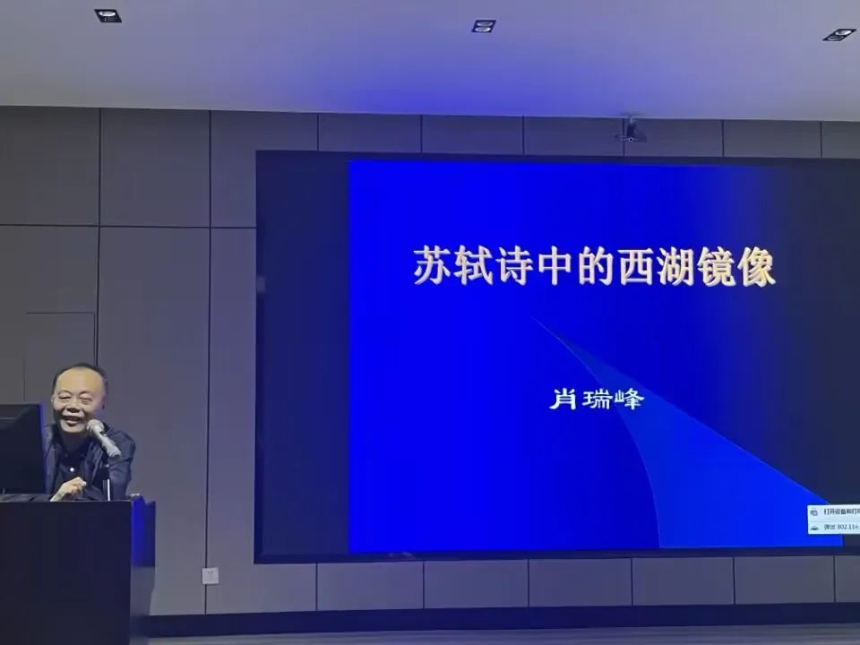 讲座伊始,肖瑞峰教授简要说明了此次讲座内容的缘由——从“重读苏轼”中获得感悟,苏轼以出神入化的诗笔描画与摹写西湖,将发轫于唐代的西湖文学推向难以逾越的高峰。讲座分为以下几个部分:第一,文化性格,苏轼摄录西湖镜像的独特视角。苏轼摄录西湖镜像时主要聚焦于湖畔人物与湖上风景,他摄入镜头的多为不染俗尘的高僧大德,摄录到笔下的湖上风景也是“清景”,这正是其文化性格“旷达、崇真、尚朴”使然。第二,淑世情怀,苏轼注入西湖镜像的民生之忧。苏轼对贫病交加的弱势群体表现出深切的同情,在纵览胜境时将他们牵引入诗。第三,身世投影,西湖镜像在苏轼诗中的阶段性嬗变。苏轼两度仕杭,心境有明显差异,这也反映在他的西湖诗创作中。