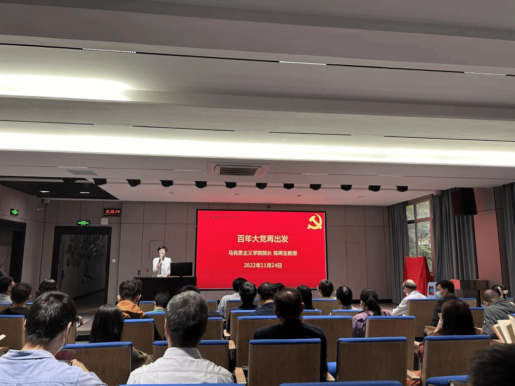 会前,学院邀请了马克思主义学院院长陈再生教授为全院教师作题为《百年大党再出发——深入学习党的二十大精神》的专题辅导报告。