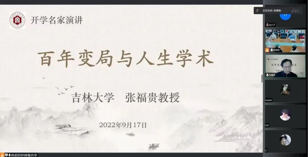 9月17日上午,吉林大学哲学社会科学资深教授、中国文化研究所所长、国家“WR计划”哲学社会科学领军人才、国家级教学名师张福贵老师受邀为太阳成城集团tyc234cc2022级全体新生带来题为“百年变局与人生学术”的线上讲座。党委书记赵丽霞、党委副书记林晓、团委书记黄小乐、2022级新生辅导员陈茹玲、2022级全体新生参加此次讲座。讲座由黄金明院长主持。