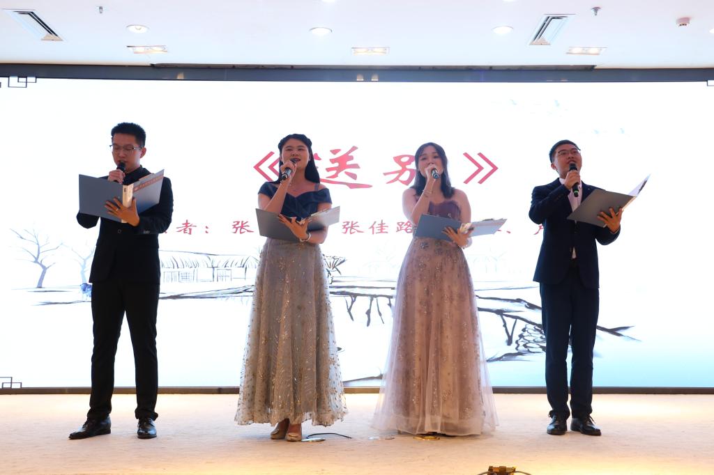 由毕业生代表张雨豪、张佳路等带来的毕业生原创诗歌朗诵《送别》,将同学们的思绪带往青葱岁月,回望四年芳华。在校生代表蒋凤艳等带来的歌曲《启程》向学长学姐送祝福,在欢快的节奏中激起同学们对未来的向往和憧憬。师长的祝福千言万语,给予奔跑在青春赛道上的毕业生无尽的力量。