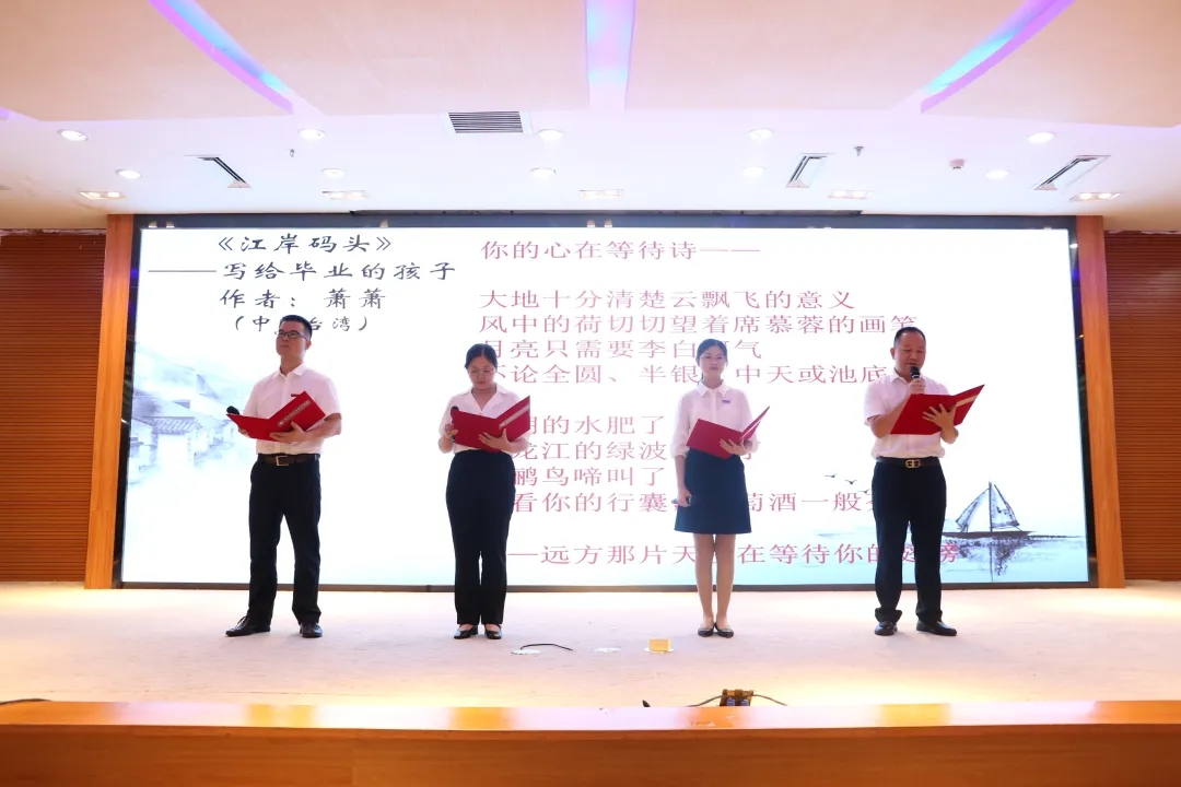 诗朗诵《相信未来》承载着赵丽霞书记、黄金明院长对毕业生的深切祝福,祝愿同学们一路繁花锦簇向未来。台湾诗人萧萧写作《江岸码头》,赠与2022届毕业生,诗歌经由谢斌斌、许新华、陈芳苹、廖利明朗诵,将师长的嘱托和祝福装在诗中,谆谆教导化作殷殷期盼,勉励同学们葆有初心,乘风破浪。台湾作家石德华写作《书剑江山》鼓励2022届毕业生捧书仗剑走天涯,由李新东、杨杏红携手在校生代表陈煜莹、马继超诵读,鼓励毕业生读万卷书,执情义剑,步步皆稳健。