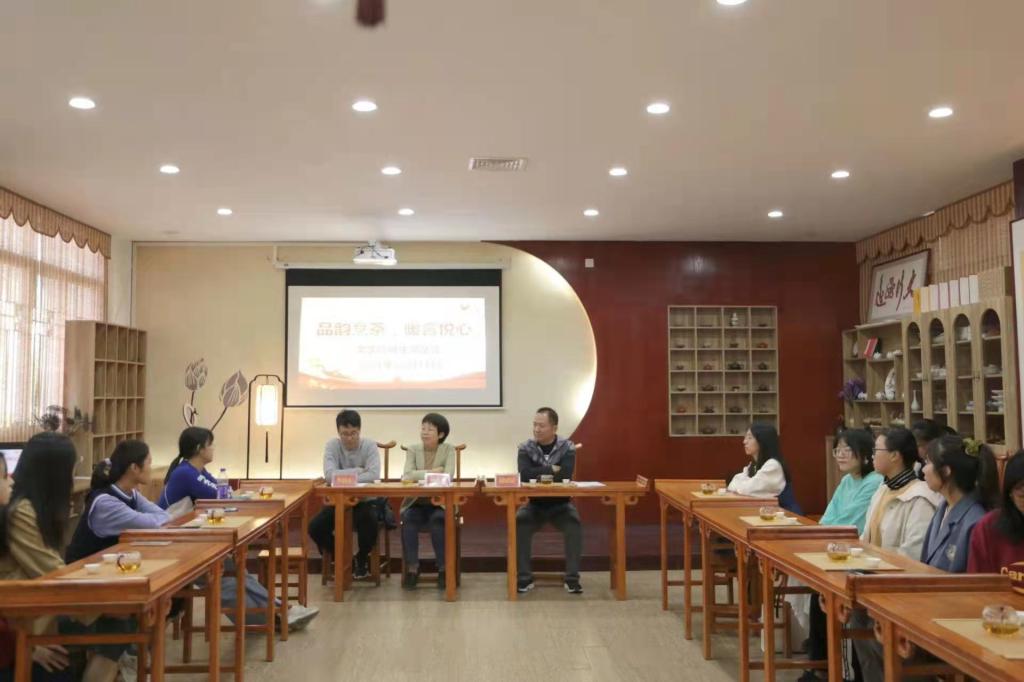 茶香韵人,话暖心间。大家的难题与困惑随着盈散的茶香被逐一解决。人生如茶,苦涩中带有甘甜,细细品味才能知其妙韵。岁月静好,今日你我共聚一堂,茶香溢满你我心间。大学生活,有苦有甜,有笑有泪。路漫漫其修远兮,静心沉淀方能结出成功之花。