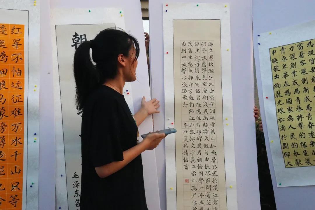 笔墨书写爱国心。本次书法展示以党在百年历史中诞生的名人箴言为主题,共选取学生软笔作品8幅,包括《沁园春·长沙》等作品。通过文化介绍宣传引导村民回顾党的光辉历程,讴歌党的丰功伟绩。通过展览艺术观赏性和思想高度并存的的书法作品,打造浓厚的家国氛围,赓续红色血脉。