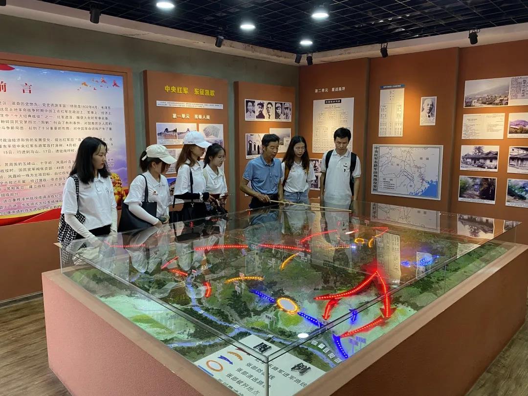 实践队成员围坐在小方木桌前,聚精会神地聆听着五峰红军园负责人胡恒青的讲解漳州战役中“平凡英雄”的感人事迹,成员们都颇受触动。“脚踏实地走古道,年少亦知远征难。”随后,在胡恒青的带领下,实践队一行人顶着烈日,沿漳汀古道蜿蜒而上,循着红军走过的路,一路登顶 “风霜岭”,接受一场重温初心的精神洗礼。
