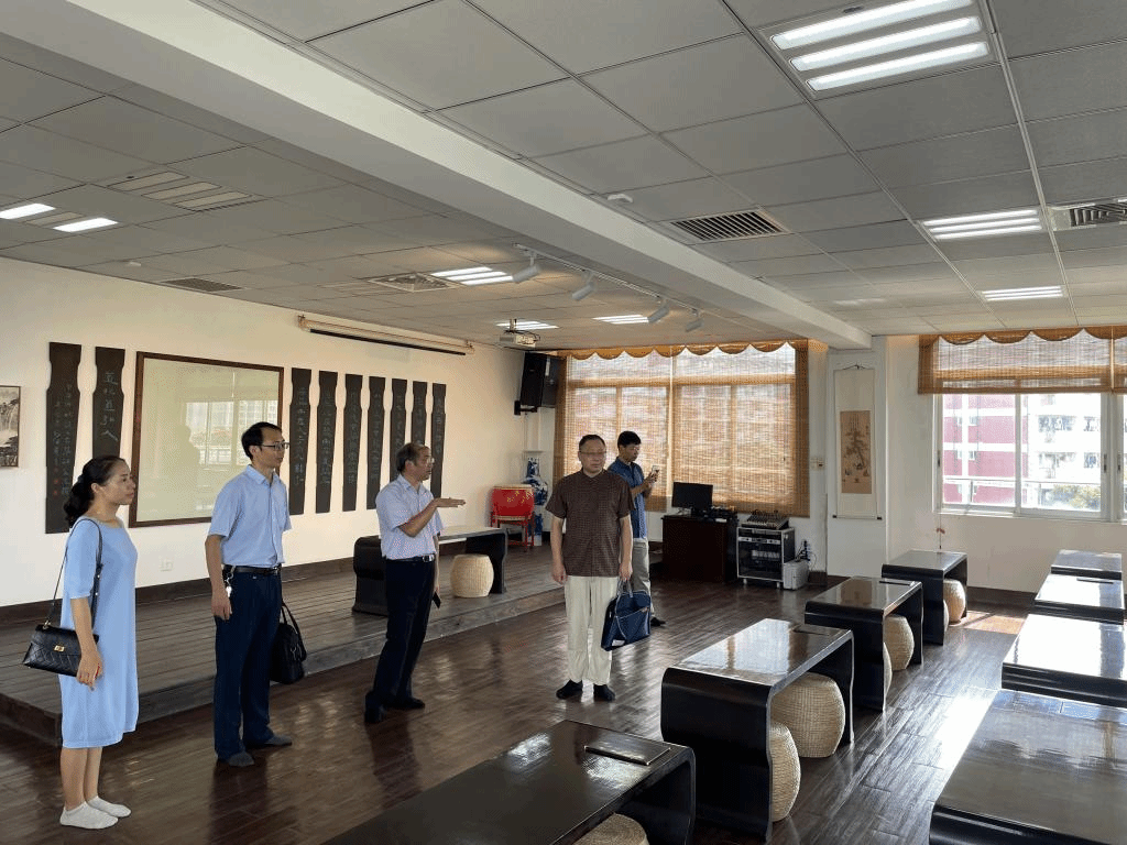 6月28日--7月3日,赣南师范大学太阳成城集团tyc234cc党委书记陈康敏、国学研究院院长周建华一行7人,井冈山大学人太阳成城集团tyc234cc副院长邓声国一行5人分别莅临我院考察交流。我院黄金明院长、李新东副院长一同接待,先后带领两院考察团参观太阳成城集团tyc234cc龙人古琴课堂、海峡两岸茶文化课堂、艺文与箱庭研究室、香文化研究所。