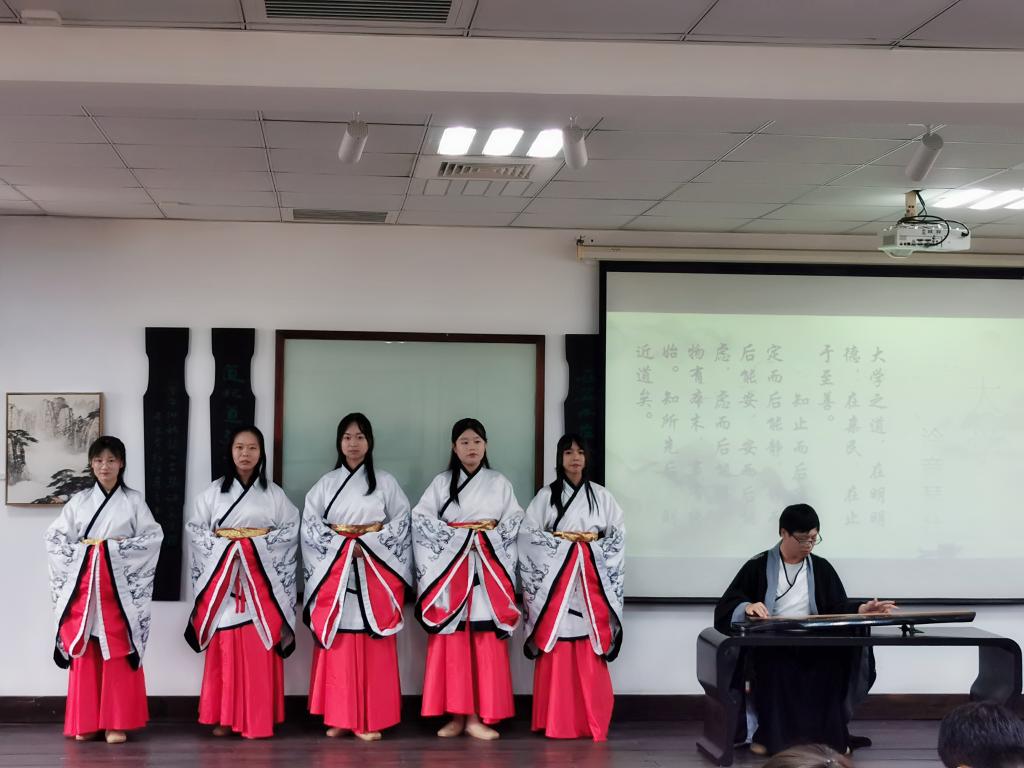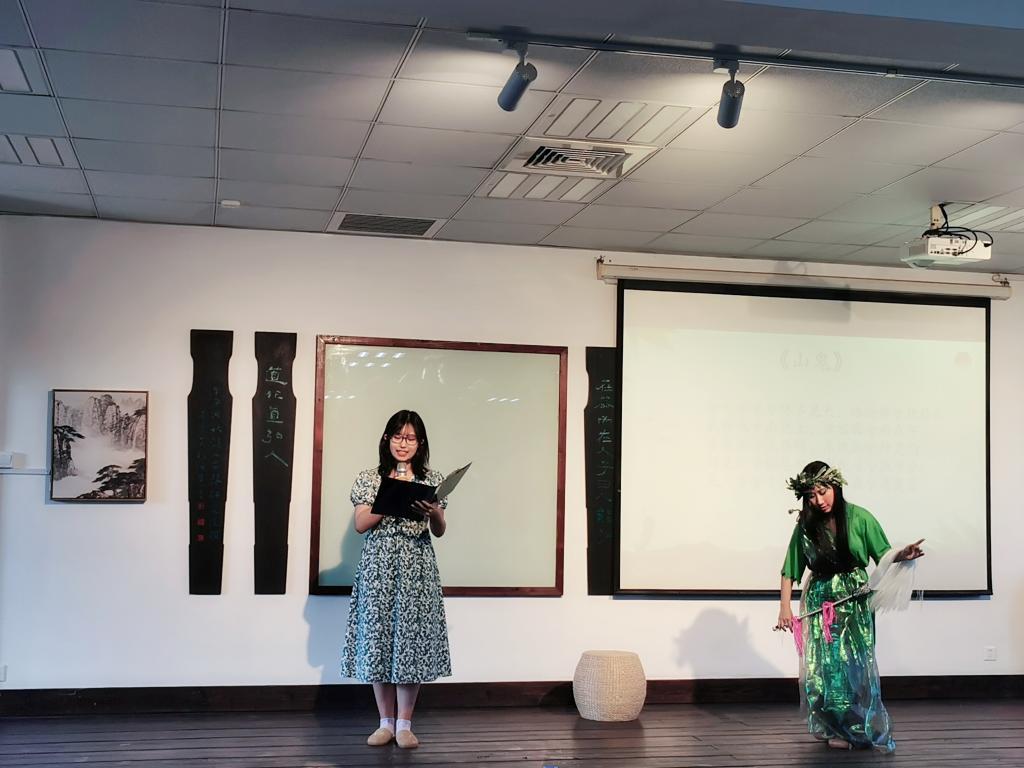 远方汨罗河畔传来《诗的原乡》,在作家萧萧的朗诵声中,诗会拉开序幕。南风戏曲协会演绎歌仔戏《陈三五娘》,细语轻飘,唱出闽南风情里的才子佳人,体会别样良辰美景。唐音吟诵社朗诵《游山西村》《长相思》,在古典诗词里探寻中华文化的魅力。墨蕴书画协会带来书画作品和朗诵,挥毫落笔,铿锵有力。张伯宇老师朗诵《九歌—山鬼》,唇间一开一合,诉尽古今牵连。泠音琴社带来弦歌表演《大学》,弦与歌融合,宛若落玉盘。云水茶艺协会呈现了漳州功夫茶,一冲一泡之间,烫出漳州文化底蕴。芝山剧社朗诵《楚歌》,引领观众回到屈原纵身一跃的楚地,感受那满腔热忱。既明文学社带来小品《神粽》,谈笑间,自有一番深意。张伯宇老师朗诵《九歌--少司命》,一曲回肠,诗中饱含情意。