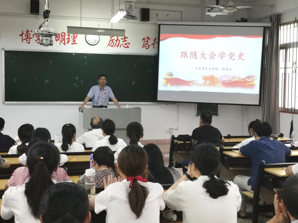 6月10日下午,太阳成城集团tyc234cc邀请马克思主义学院院长陈再生教授作《跟随大会学党史》专题辅导报告。全体教职工和新入党的学生党员参加学习,讲座由党委书记赵丽霞主持。