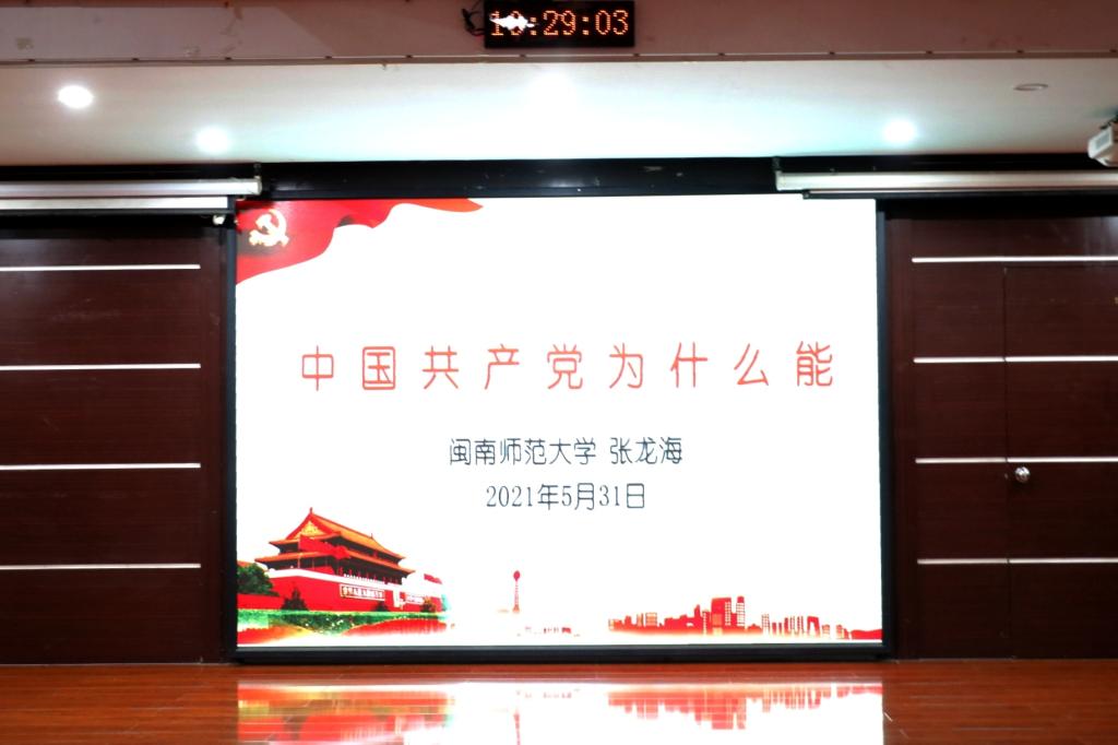 在报告中,张龙海副校长首先用自己的亲身经历为同学们生动地讲述了在中国共产党领导下中国人民的生活发生的翻天覆地的变化,经历了从站起来、富起来再到强起来的光辉历程。接着,他将本次报告分为科学的理论指导、坚定的理想信念、强大的组织优势,坚实的群众基础和彻底的自我革命这几个方面,深刻地为同学们剖析了“中国共产党为什么能”这个主题。从1921年成立伊始,中国共产党就坚定地拥护马克思主义,并结合自己的实际,发展了毛泽东思想、邓小平理论、“三个代表”重要思想、科学发展观和习近平新时代中国特色社会主义思想。从最初成立的几十人,到如今的九千多万党员,中国共产党始终坚定理想信念,用强大的组织优势,从严治党,成为一个名副其实的世界大党。最后,张龙海副校长对同学们提出了殷切期望:多学党史、多了解时事,做一个中国特色社会主义新青年。
