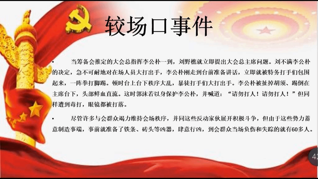 1946年1月10日至31日,政治协商会议在重庆召开。这次会议通过了有利于人民、不利于蒋介石统治的决议,受到了人们的欢迎。但蒋介石却耍两面手段,一面在政协会议的决议上签字,一面却随时准备撕毁决议,挑起内战。1946年2月10日上午9时30分,国民党反动势力趁重庆各界人民群众在较场口庆祝政协会议召开之际,制造了重庆较场口血案。就这样国民党借由较场口血案,使得政治协商会议通过的种种决议被国民党反动派公开撕毁。