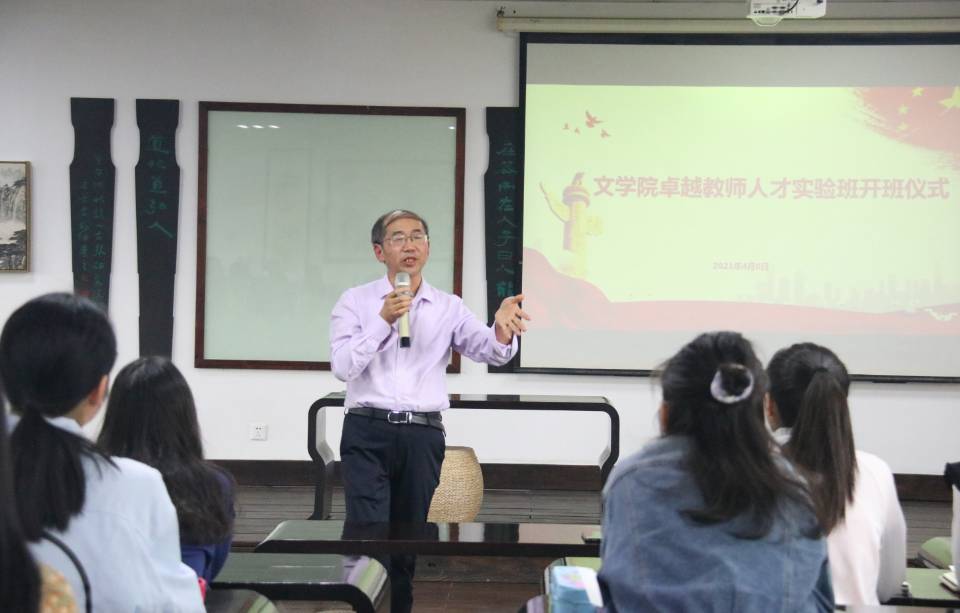 黄金明院长在讲话中表示,开设卓越教师人才实验班是太阳成城集团tyc234cc高层次太阳集团规划的关键一步,同时引导学生主动关注和适应信息化时代的到来,明确信息材料收集的重要性,培养自身对于信息的把握和查找能力、储存表达能力,借此深入对文学的研究性学习,提高自身综合能力。他提出技术进步对文学研究的重要意义,学院将结合信息化时代和学生成长需求,积极搭建与更高水平人才一对一跟踪、交流、探讨的平台。黄金明鼓励同学们将专业学习与信息技术相结合,利用相关技术将不同知识连接起来,做到融会贯通、创新发展。