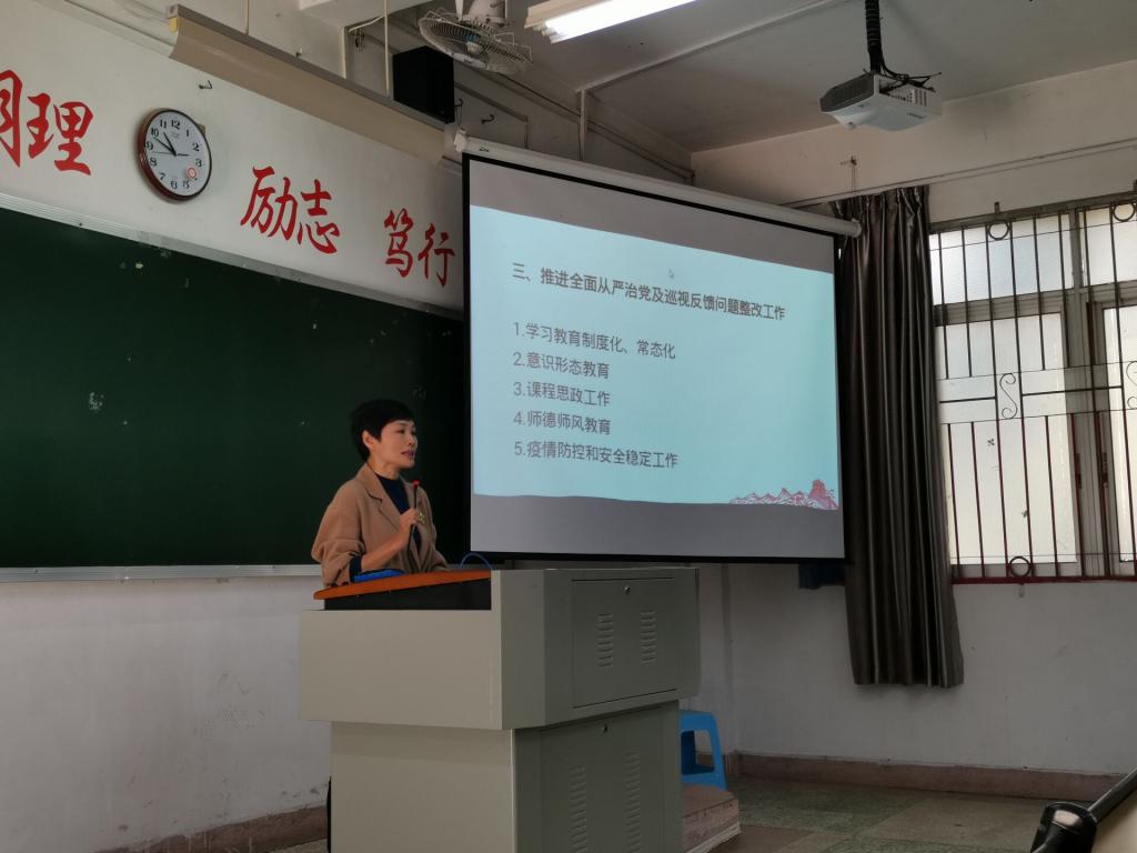 在课程思政问题,她指出,在课堂上落实立德树人的根本任务,铸就教育之魂,这是新时代教师的职责,要注重理念创新和实践创新,结合去年省委巡视组对课程设计、课程组织过程等方面如何融入思政元素做好整改提升。本学期实现课前10分钟的党史教育宣讲,在文化解读中渗透爱党爱国情怀,启迪思想、引人向上、全员育人。在党建工作方面,各支部要扎实推进 2021 年发展党员工作落深落实。教师支部拟发展 2名党员,学生拟发展近180名党员,同期增长 60%,请各支部根据发展计划,强化考察对象的过程管理,保质保量完成发展指标;规范党内组织生活,定期举行“三会一课”,推进党史学习教育走深走实,开展好党员民主评议工作;坚持每天自学,保障学习强国时数。