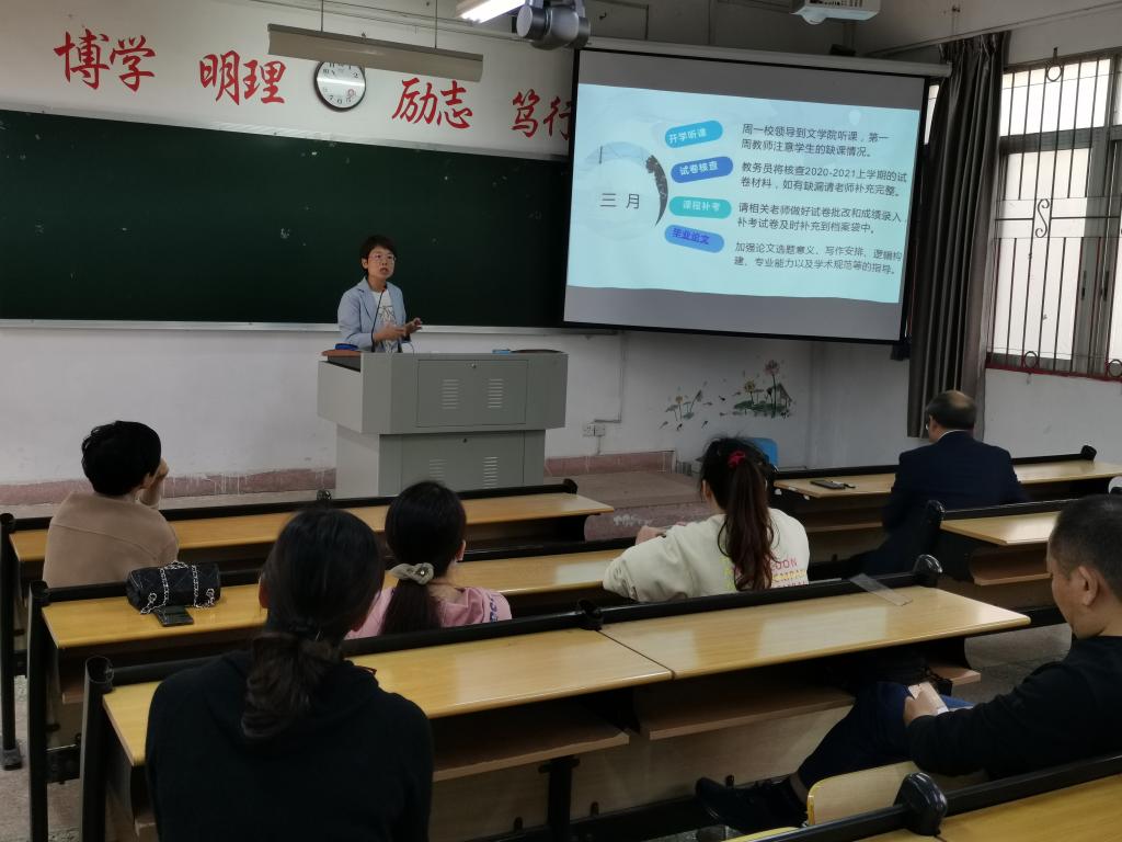 会上,赵丽霞首先传达了吴彬镪书记《再学习再调研再落实—奋力推进学校“十四五”开好局起好步 》和李顺兴校长《继往开来 砥砺前行-全面推进高水平师范大学建设》等工作报告,强调了2021年学校工作的总体思路。她同时传达了学校全面从严治党工作会议暨省委巡视整改推进会会议精神、学校党史学习教育动员大会精神和学校安全稳定工作会议精神。结合学院实际,对新学期党建、意识形态、安全稳定以及党史学习教育进行了布置。副院长黄琳琳、杨杏红分别介绍了新学期本科教学、疫情防控、行政管理等相关工作安排。最后,黄金明院长指出了太阳成城集团tyc234cc本学期工作重点以及五大难点,号召全体教师众志成城,在国家一流本科申报、国家语言文学基地申报、一级学科博士点、学科评估(努力挤进全国70%的排名) 、教师项目申报、论文发表等方面共克难关,推进学院高质量发展。