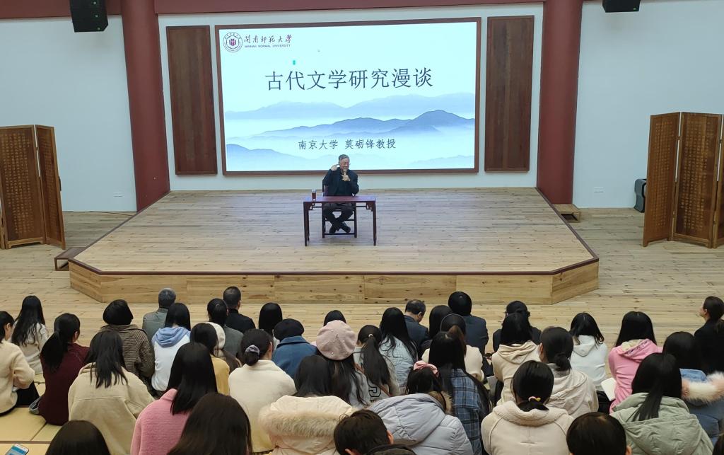 讲座伊始,莫砺锋教授回忆自己在南京大学的求学经历,他提到学术研究必须注重两点:一要补不足,打功底;二要锻炼学术眼光。莫教授以当今“李杜”论文难写为例,指出论文难写的原因是积累不足。他强调了文献学功底的重要性,并指出从事古代文学的学习与研究,要穷尽一切可能去找材料,切忌以偏概全;要有分辨文献真伪的能力;要注重整理与研究文献;认清材料是根本,注意文献是基础,不可脱离文本研究。紧接着,莫教授从句读、离经辨志、平仄韵律等角度说明了古汉语功力在古代文学学习与研究中的重要性。