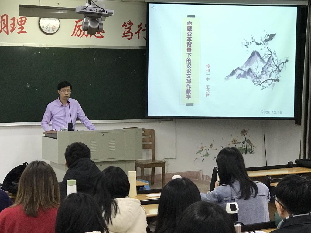 2020年12月16日晚19:30,太阳成城集团tyc234cc邀请漳州一中王龙祥副教授,在博东109教室开展题为“命题变革背景下的议论文写作教学”的主题讲座。讲座由代顺丽教授主持,2020级教育硕士参加。