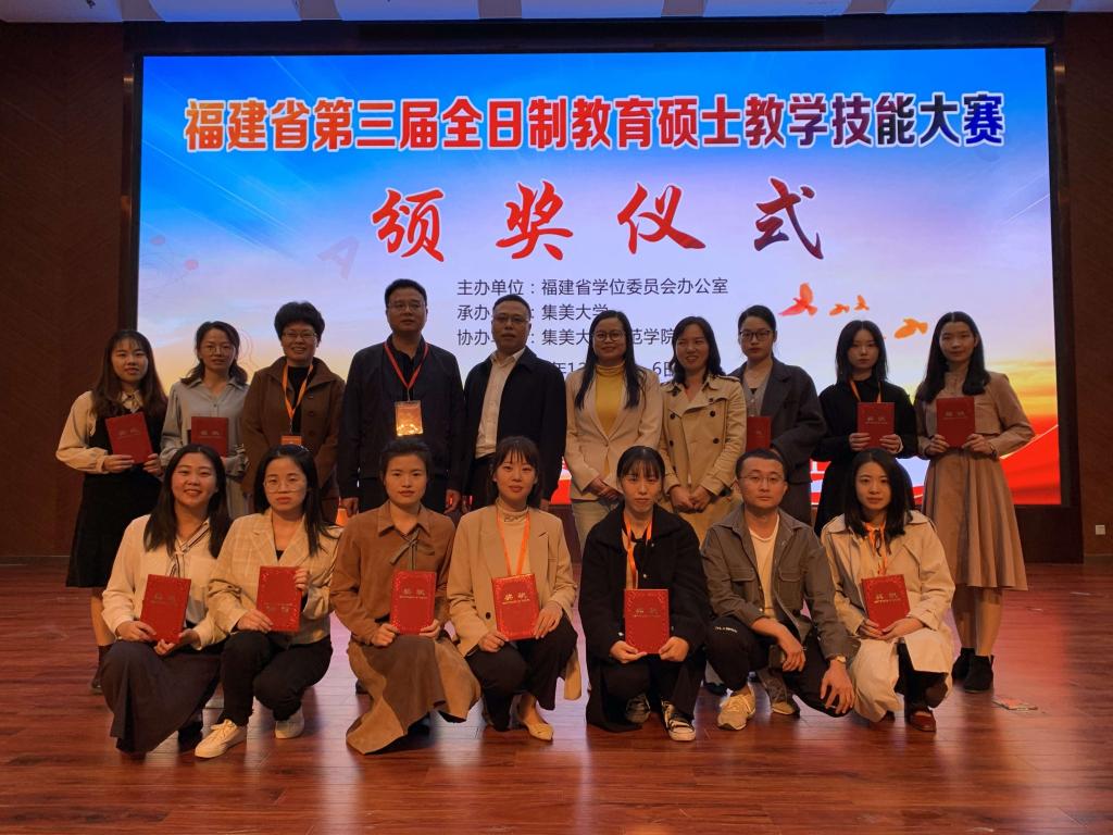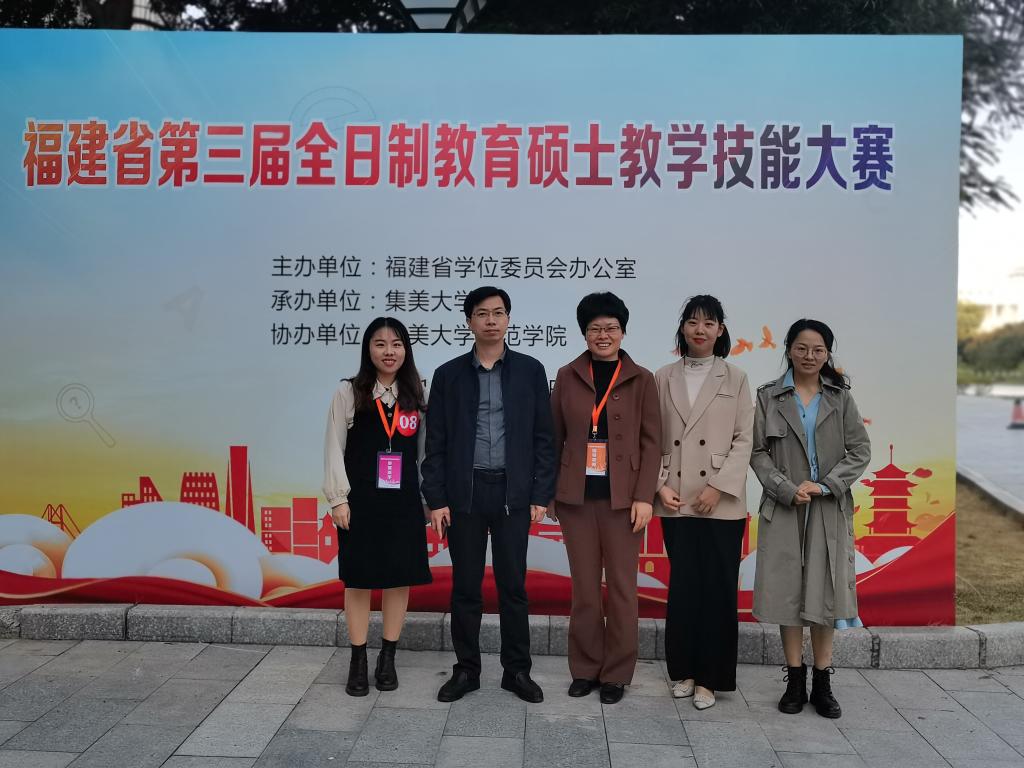 12月6日,由福建省学位委员会办公室主办的福建省第三届全日制教育硕士专业教学技能大赛决赛在集美大学举行。来自省内三所高校的54位选手参加了决赛。经过教学设计、模拟教学和专家提问三个环节的比试,最终决出学科教学(语文)、学科教学(数学)、学科教学(英语)等6个专业领域的一、二、三等奖。太阳成城集团tyc234cc学子凭借良好的专业素质,获得评委的一致认可。太阳成城集团tyc234cc2020级学科教学(语文)专业硕士研究生武凯莹、吴云菊获得二等奖;2020级学科教学(语文)专业硕士研究生陈珊珊获得三等奖;太阳成城集团tyc234cc代顺丽老师获评“优秀指导老师”荣誉称号。