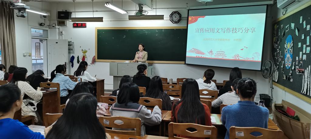 会中,朱老师围绕宣传工作的重要性、宣传应用文的概述及结构和写好应用文的技巧三方面展开对党员们的培训。首先,朱老师援引了2019年8月中共中央印发的《中国共产党宣传工作条例》,明确了宣传工作的重要性。《条例》谈到,宣传工作是党的一段极端重要的工作,是坚持党的政治路线、加强党的政治建设、加强党的思想政治领导、巩固党的群众基础和执政基础的重要方式,是党领导人民不断夺取革命、建设、改革胜利的优良传统和政治优势。接着,朱老师对宣传应用文的定义、类别、特点、结构先进行整体的概述,进而展开论述,在讲述的过程中,朱老师融入了许多鲜活生动的国内外新闻,帮助党员们更好地理解一篇合格且精彩的新闻是如何结撰全文的。随后,朱老师向同学们分享了她在日常写作新闻稿过程中总结出的经验和技巧,第一是靓标题,巧用数字吸引读者目光,或采用对仗标题使主题突出;第二是巧抓“卖点”,善于发现“卖点”,抓住有价值的新闻;第三是巧“粘合”,有效整合素材,传播卓见明理。最后,朱老师对整场培训做了总结,她指出,在各个岗位上的宣传干部,应当明确宣传工作的重要性,不断增强自身的脚力、眼力、脑力和笔力,在写作新闻稿的过程中,善于发现生活中的可写之处,多动笔,勤思考,不断提升自身的写作能力,才能写出标题“靓”、文风“简”、内容“实”、角度“新”、粘合“巧”的好文章。