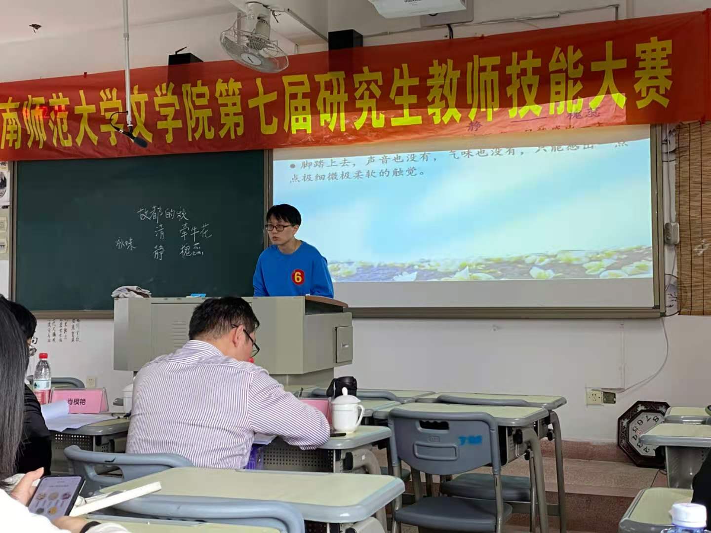 本次比赛采用八分钟片段教学方式,参赛选手自选参赛篇目现场教学。比赛中,选手们准确把握教学重难点,巧妙设计教学过程,语言表达幽默风趣,教学方法各具特色,给大家留下深刻印象。如学科教学(语文)专业的陈珊珊深入浅出地讲解了《故都的秋》,引导学生思考文章的思想情感;吴云菊在高昂的乐曲声中饱含感情地朗诵了《将进酒》,引人入胜;刘翔授课角度新颖,逻辑严密,围绕《荆轲刺秦王》文中“荆轲的‘败’”设疑激趣。选手们娴熟驾驭课堂教学,均展现出了扎实的教学基本功。