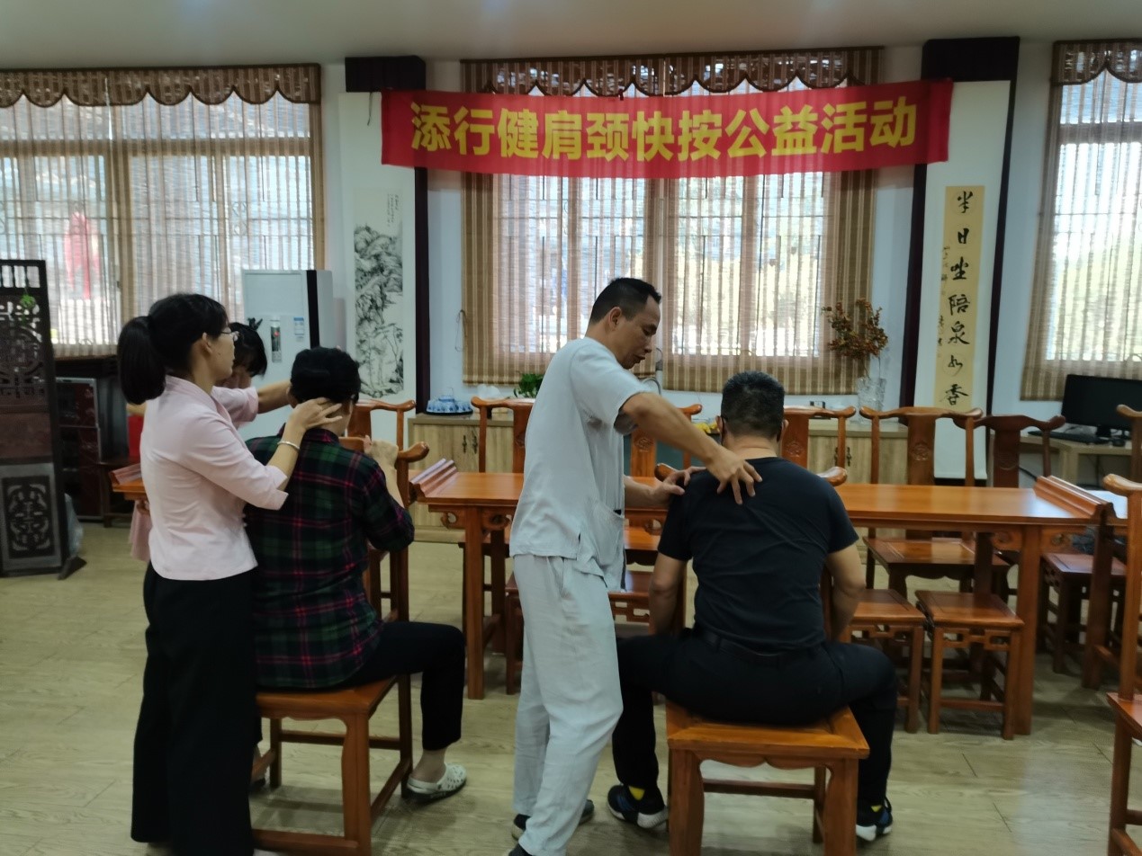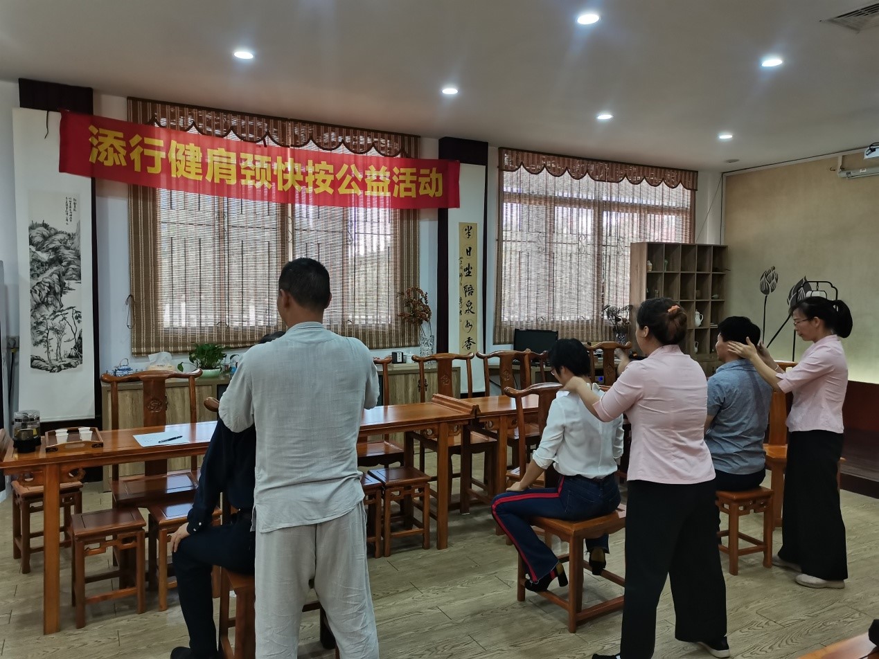 添行健调理师与各位老师一对一展开测试,询问日常坐姿,与老师们共同发现长期伏案造成的肩颈酸痛点,提供养生建议,并进行一次系统的肩颈推拿。伴随着专业的推拿,各位老师逐渐放松下来,通过调理肩颈缓解了身心的疲惫。随后,大家一起交流如何舒缓长期站立、长期伏案导致的肩颈酸痛问题。