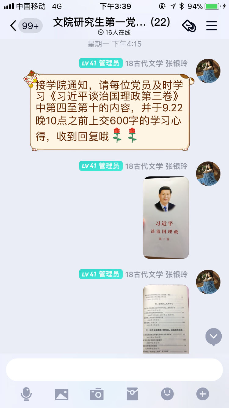 研究生第一党支部紧密联系本职工作展开研讨。支部书记陈芳苹表示,我们要不断的用理论来武装思想。要学习党的“最新教材”,推动“最新教材”学习往“实”里走。坚持在学中干、干中学,关心国计民生,注重强化系统思维,坚持把《习近平谈治国理政》第三卷与先期出版的第一卷、第二卷联系起来,切实提升研究生理论理解能力与理论运用能力,以真才实学为中国教育事业服务。学生第一党支部组织在线学习,党员杨洁提出,重视教育,尊崇人才,是中华民族的优良传统,古有耕读传家,今讲教育兴国、教育富民,办好人民满意的教育,不仅是民心之所盼,也是国家民族复兴之基。我们要珍惜时代发展提供的机遇,夯实师范生技能,提升综合素养,以“准教师”优化自身的言行。