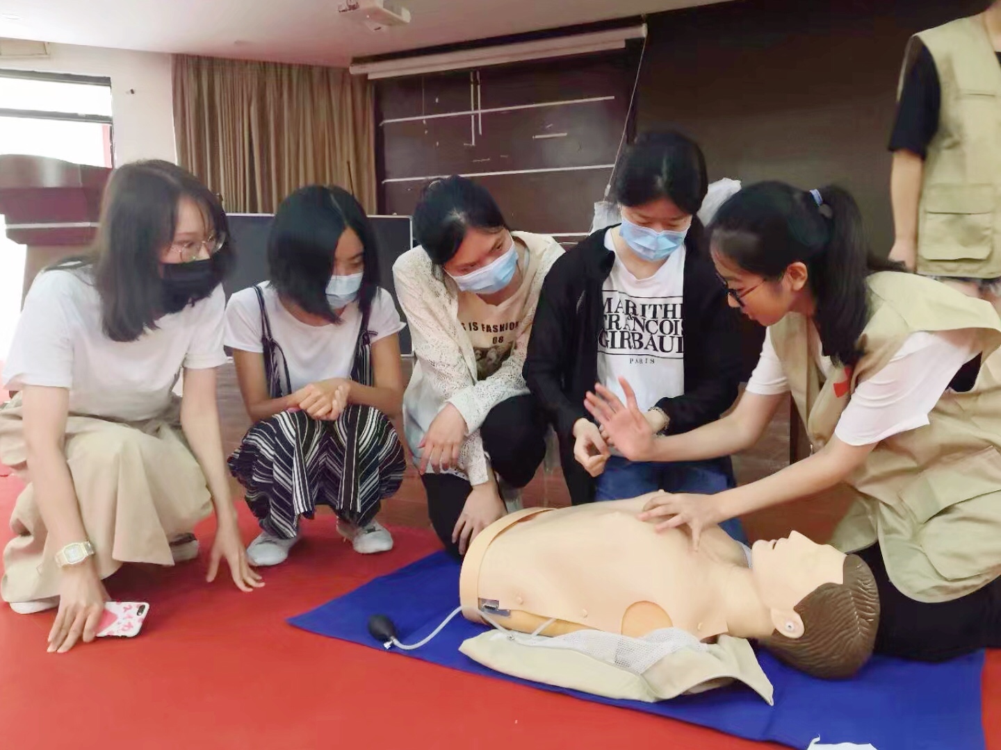 随后,学校青志红十字会的志愿者们分步骤地示范了胸外按压和人工呼吸等心脏复苏急救动作,现场同学踊跃参与了心脏复苏的模拟练习。这场演练既让同学们更好地亲身体验急救动作,又让急救知识得到了更实质性的普及。