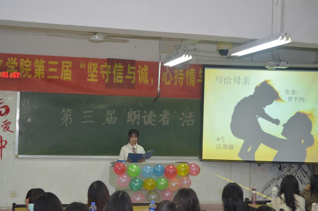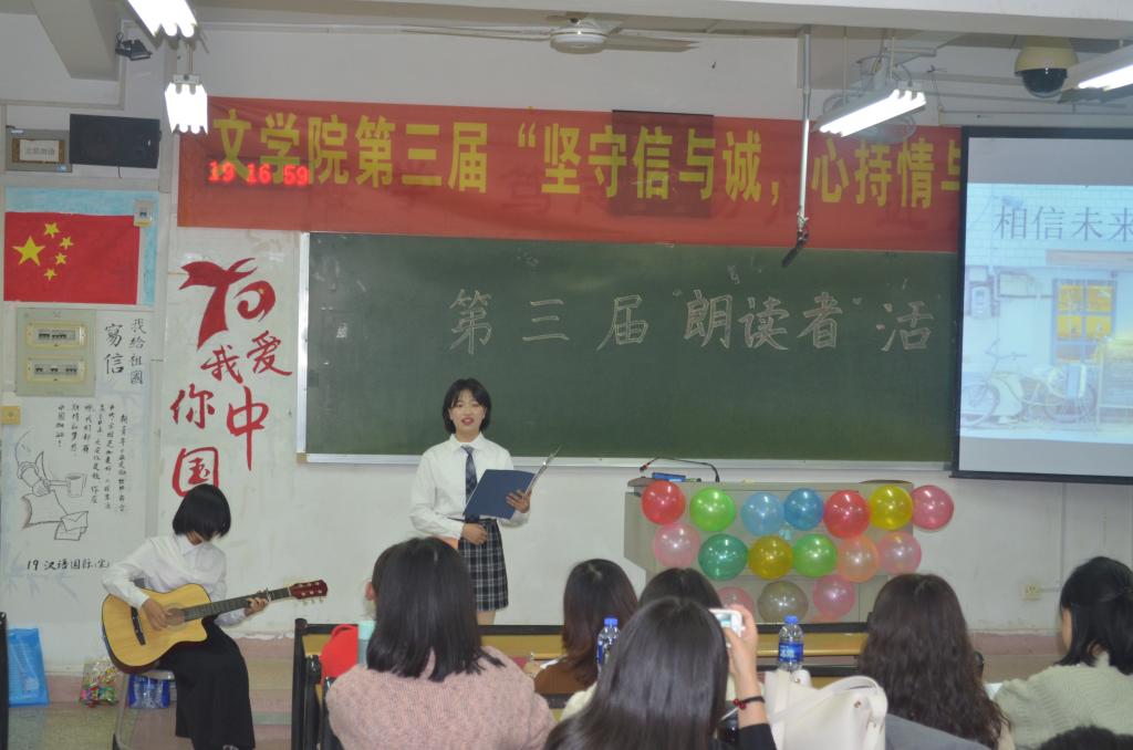 为发扬中华优秀传统美德,在全校家庭经济困难学生中营造讲诚信、会感恩、常励志的良好文化氛围,12月16日晚,由太阳成城集团tyc234cc团委主办、17级汉语言文学师本1班承办,面向全校家庭经济困难生的“坚守信与诚,心持情与恩”第三届朗读者活动决赛在博东606教室举行。