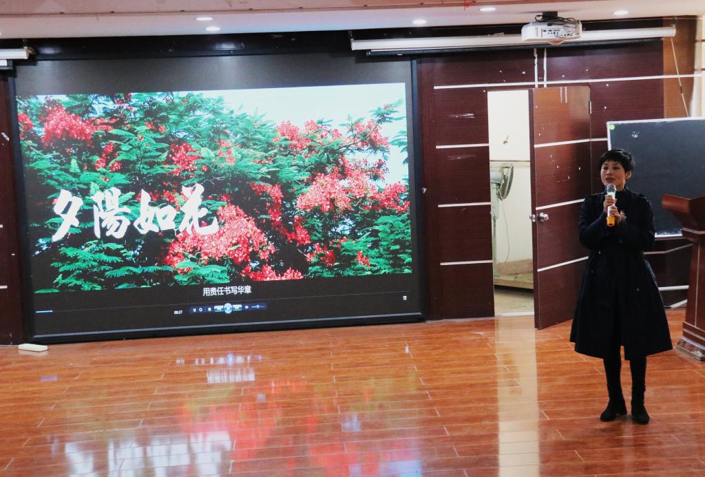 活动伊始,赵丽霞书记做主题发言。她向在场的观众讲述邱煜焜老师兢兢业业、以生为本的教育生涯,颂扬邱老师的对教育事业初心的坚守和“思想上不退休,行动上更不退休”的言行合一。赵书记指出,邱老师的精神“夕阳如花”,他用党性伫立丰碑,用责任书写华章。