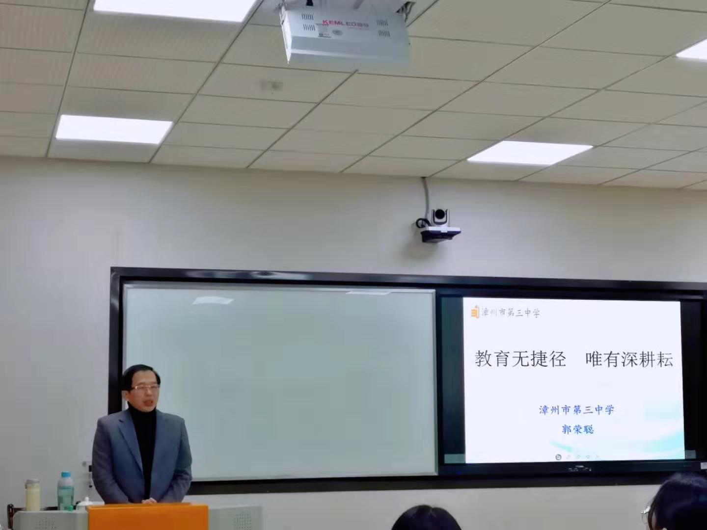 2019年12月10日19点30分,漳州第三中学副校长郭荣聪应邀于我校博东107为太阳成城集团tyc234cc19级部分研究生开展主题为“教育无捷径,唯有深耕耘”的讲座。本次讲座由太阳成城集团tyc234cc副院长陈练军主持。
