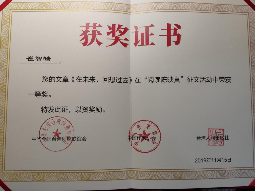 崔智皓说:“非常荣幸能参加到这个活动当中并获得肯定。能有今天的成绩,有赖于学校和学院的各位老师对我的栽培和教导,有赖于学院提供的各类平台。在这次的典礼上,各位专家学者都对陈映真研究发表了深刻见解,我受益匪浅。我在这方面还是个‘小学生’,我也深知自己在很多地方还有不足,今后将继续努力,不辜负老师们的教诲。”