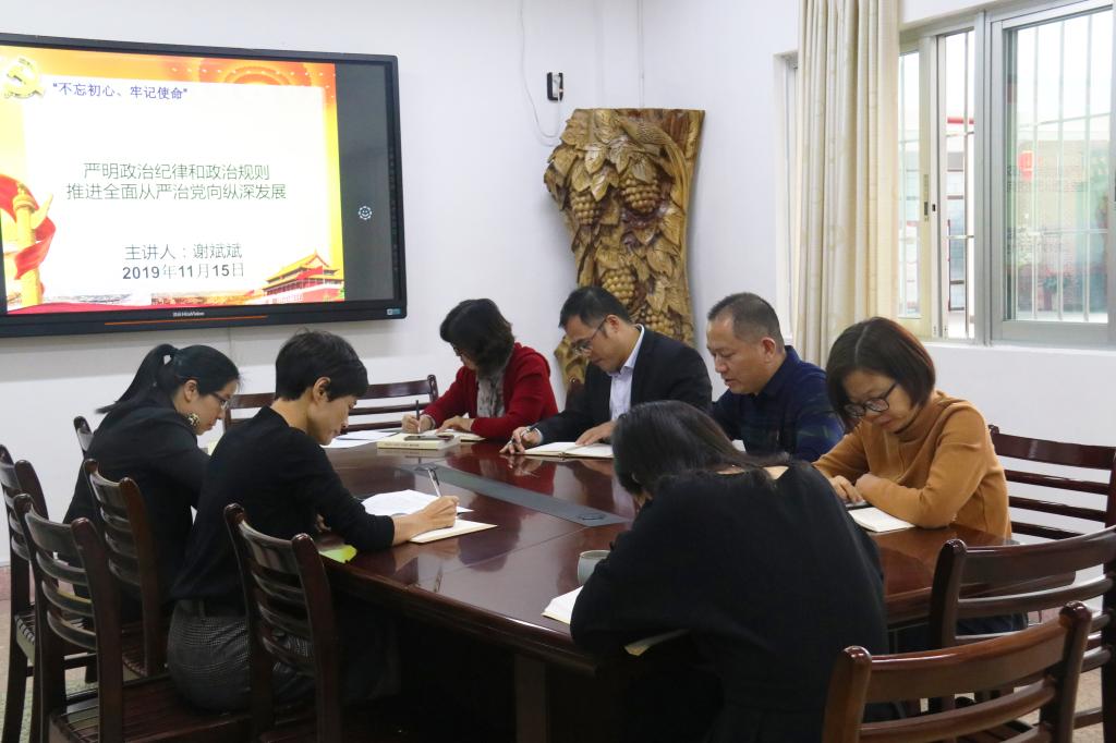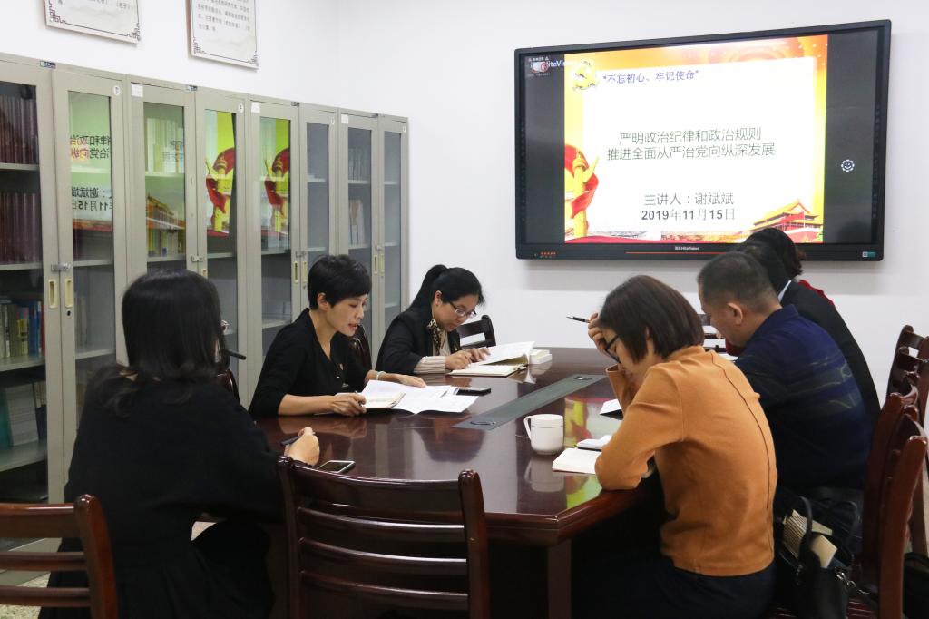 11月15日上午,太阳成城集团tyc234cc在博东111教室召开“不忘初心、牢记使命”主题教育第六次集中学习研讨,本次会议主题为“严明政治纪律和政治规则,推进全面从严治党向纵深发展”。研讨会由太阳成城集团tyc234cc党委书记赵丽霞主持,全体政党领导班子参加。