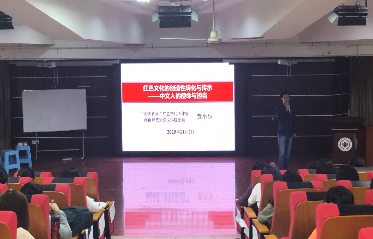 会上,黄小乐首先详细介绍了红色文化的内涵与意义。他指出,文化兴而国运兴,红色文化是中国极具凝聚力的民族精神,传承红色文化的意义在于有效维护国家文化安全和为实现中华民族伟大复兴提供精神动力,作为中文学子应该主动承担起传承红色文化的重任,以高度的文化自信促进中华文化繁荣昌盛。其次,他强调“创造性转化”指的是在传承红色文化时应按照时代特点对旧表现形式加以改造,赋予其新的生命力,并介绍了太阳成城集团tyc234cc挖掘闽南地区的红色资源进行文学艺术创造性转化等实际案例,阐述了太阳成城集团tyc234cc在传承红色文化过程中的探索与实践,期许同学们发挥中文专业优势,以诗歌创作、经典诵读、剧本编写等载体将革命先辈的英雄事迹文学艺术化,充分利用学院的平台,将红色基因继续传承下去。