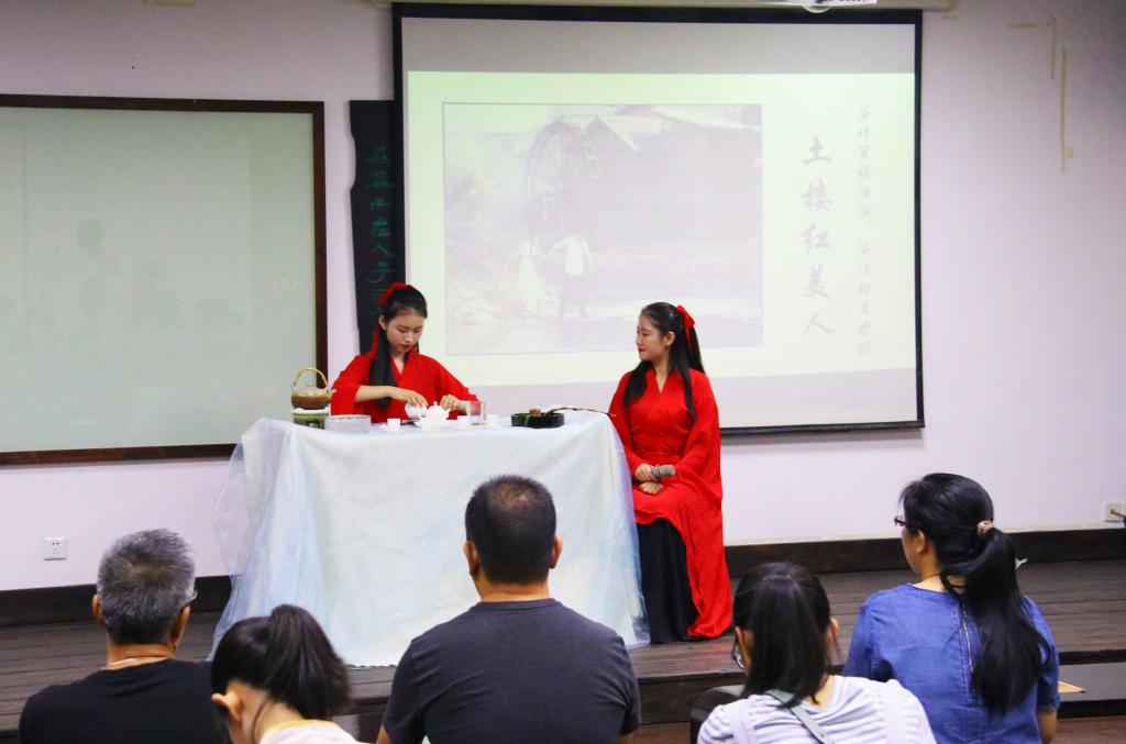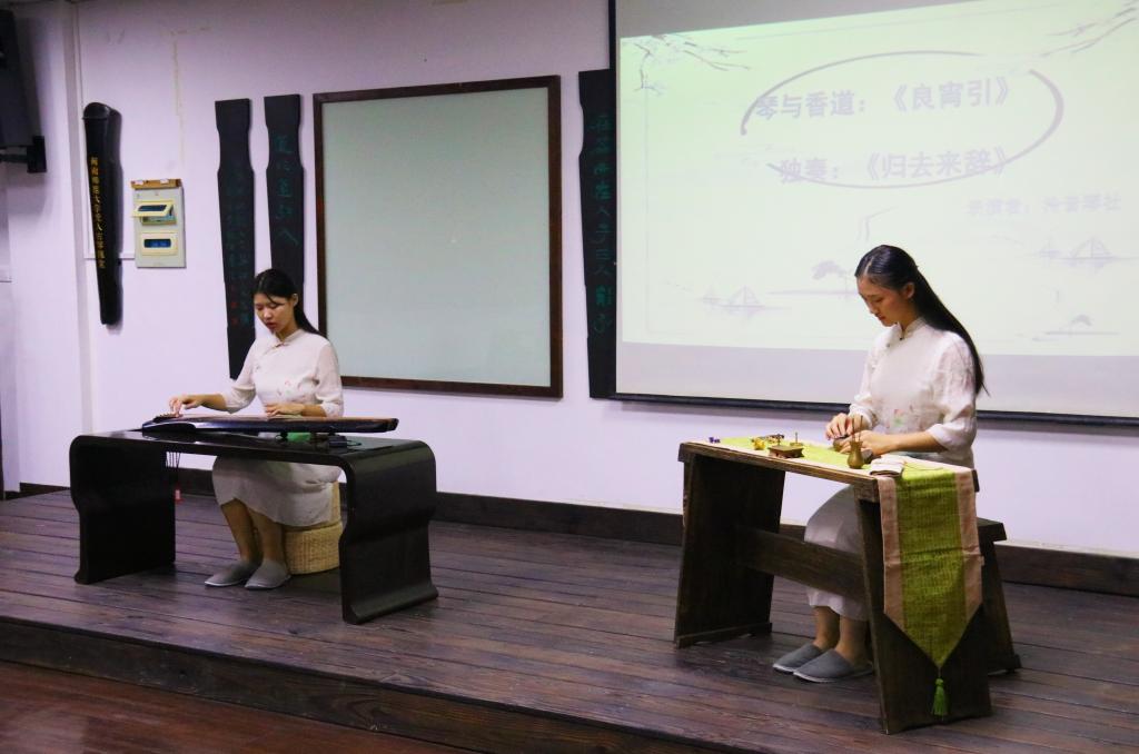 诗会在泠音琴社演奏的《良宵引》的幽幽琴声中拉开帷幕,鼓瑟笙箫,以琴传情,一曲《归去来辞》亦是婉转动听,引人入胜。唐音吟诵社合诵《山居秋暝》《奉和令公绿野堂种花》《赠汪伦》诗三首,诗中有味,曲中含情。芝山剧社主诵部独诵《劝学》,感念师恩,余韵绵长。南风戏曲协演绎歌仔戏《听秋》,声声幽韵,兄妹情谊缓缓铺陈推开,体现出闽南语的文化底蕴。云水茶艺协会演出说茶《一至七字诗·茶》,茶语悠扬,诉万物真情。最后,墨蕴书画协会、泠音琴社、既明文学社一同带来书画展示,书中氤氲墨香,丹青吐露真情。