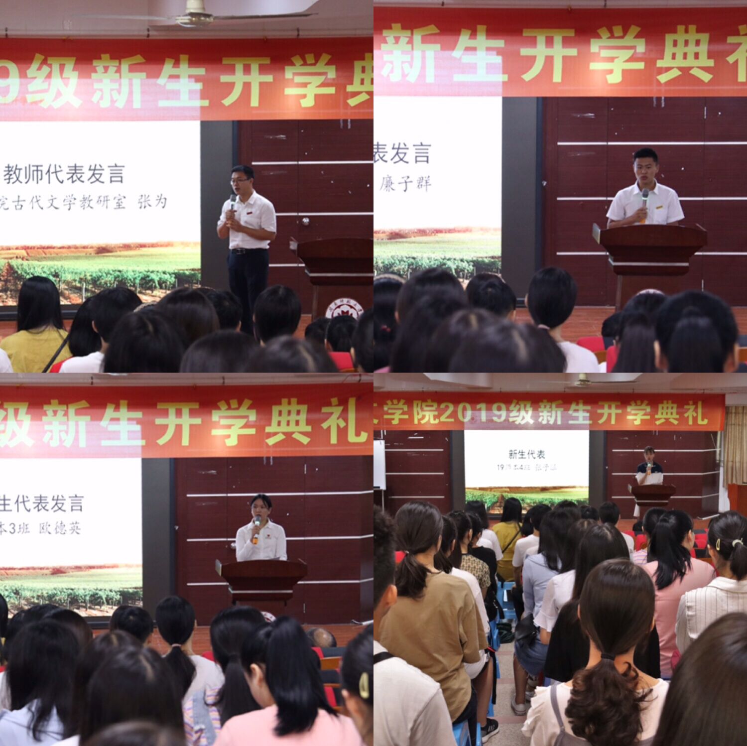 教师代表张为、研究生代表廉子群、本科生代表欧德英、新生代表张子涵相继上台发言。学院还特意邀请四位来自不同地区的新生,向他们的父母献花,表达感恩之情。