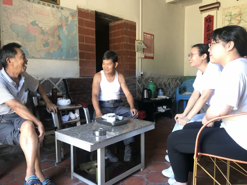 调研团队统一着装,精神抖擞,一行在龙水村村干部的带领下走村入户,通过走访了解漆篮匠人的分布情况。通过与漆篮代表性传承人郭清柏的交流,团队成员了解到:龙水村约200户人家,现在还在做漆篮的人约150人,平均年龄在50岁以上,只有极个别年轻人会以制作漆篮营生。接着,郭清柏指引团队拜访福建省级非物质文化遗产传承人郭金彪。郭金彪为团队成员深入讲解了现在漆篮存在的劣势,并对调研团队提出了参赛建议,一是创新漆篮的样式功能,紧跟时代潮流;二是坚持手艺传承,将漆篮发扬。最后,团队又陆续前往了龙湖村、山后村等村落,与当地村干部进行交流,进一步了解漆篮在其他村落发展现状。