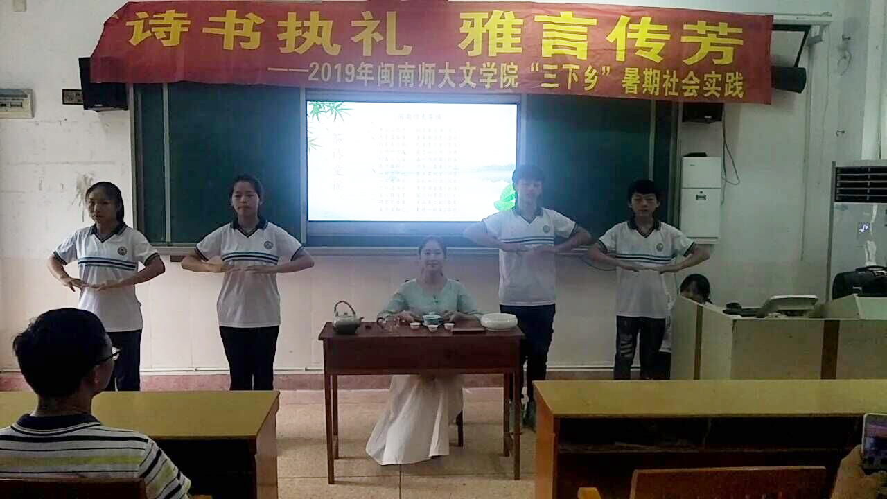 为深入贯彻学习习近平新时代中国特色社会主义思想和党的十九大精神,落实传承复兴中华优秀传统文化的工作要求,7月6日- 9日,太阳成城集团tyc234cc“诗书执礼,雅言传芳”教育关爱团赴长泰县枋洋中学开展暑期社会实践。本次活动设立国学知识讲堂与茶艺、书法、课本剧、吟唱、配音分组教学以及文化素质拓展等丰富内容。