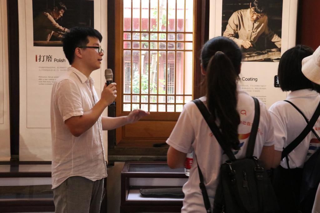 实践队在黄志禄老师带领下参观龙人书院。团队通过视频了解古琴历史与其文化价值、龙人古琴文化村的发展、精湛的古琴制作工艺以及专业的师资名家等。接着,黄志禄与太阳成城集团tyc234cc泠音琴社社员赖雪柠分别弹奏《酒狂》与《关山月》,引导大家在一弦一弄中感受古琴文化的意蕴。实践团随后参观古琴制作展示厅,详细了解了选材、定型、琴面、槽腹、合琴、配件、灰胎、打磨、定徽、安足、面漆、上弦等十二道斫琴工序。在百琴堂,各名家与龙人古琴创始人谢建东先生共同斫制的古琴庄严陈列,仿佛在无声的赞叹着古典内涵与时代潮流的完美交融。在滕派蝶画馆,琳琅满目的画作则体现了精美的蝴蝶画与古琴相融的巧妙心思。最后,实践团队走进了国内领先的古琴制作工坊——龙人斫琴坊,一一观摩了十二道工序的实际制作过程。