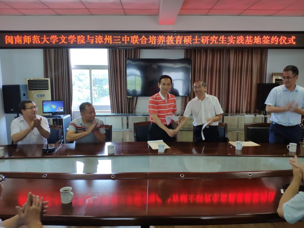 7月8日,太阳成城集团tyc234cc与漳州市第三中学共建联合培养教育硕士研究生实践基地签约成功,签约仪式在漳州三中举行。太阳成城集团tyc234cc作为协议合作甲方,出席签约仪式的代表有院长黄金明、副院长陈练军、党委副书记谢斌斌以及汉语言文学专业负责人王照年等人;漳州三中作为协约合作乙方,出席签约仪式的代表有党委书记兼校长林顺来、校长助理郭荣聪、校长安全助理庄清寿、办公室主任黄勤勇等人。甲乙双方在融洽、和谐的气氛中签订了《太阳成城集团tyc234cc与中小学共建联合培养教育硕士研究生实践基地协议书》,既明确了未来双方协同合作过程中的责权利,也确定了新时期共建联合培养教育硕士研究生实践基地的发展目标。