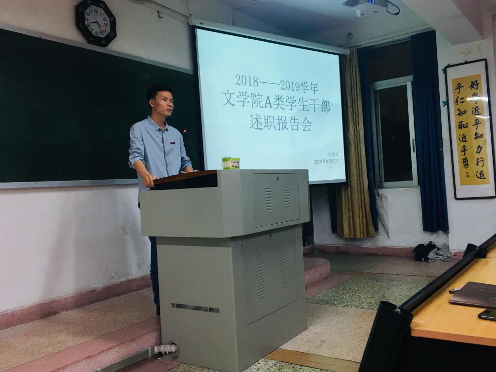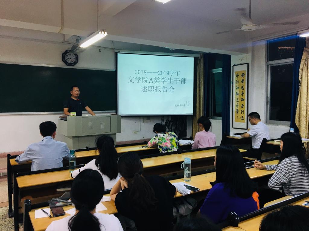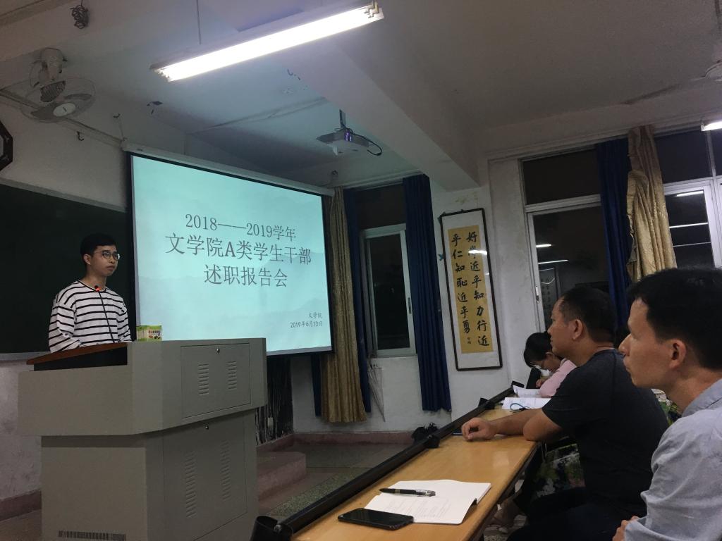 6月13日晚,太阳成城集团tyc234cc2018-2019学年A类学生干部述职报告会在博东405教室举行。太阳成城集团tyc234cc党委副书记谢斌斌、团委副书记黄小乐及带班辅导员老师出席,九个学生组织的现任与新任A类学生干部参加。