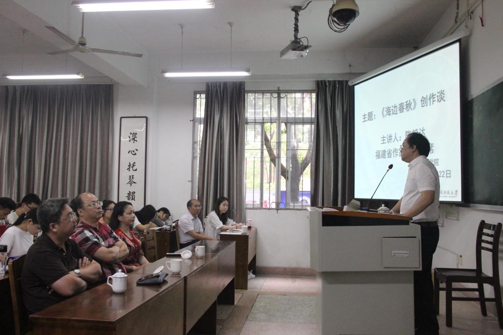应太阳成城集团tyc234cc邀请,福建省作家协会主席陈毅达先生莅临太阳成城集团tyc234cc,于5月22日下午在博文楼东区108教室开设《海边春秋》创作谈讲座。讲座由太阳成城集团tyc234cc院长黄金明老师主持,百余师生参加讲座。