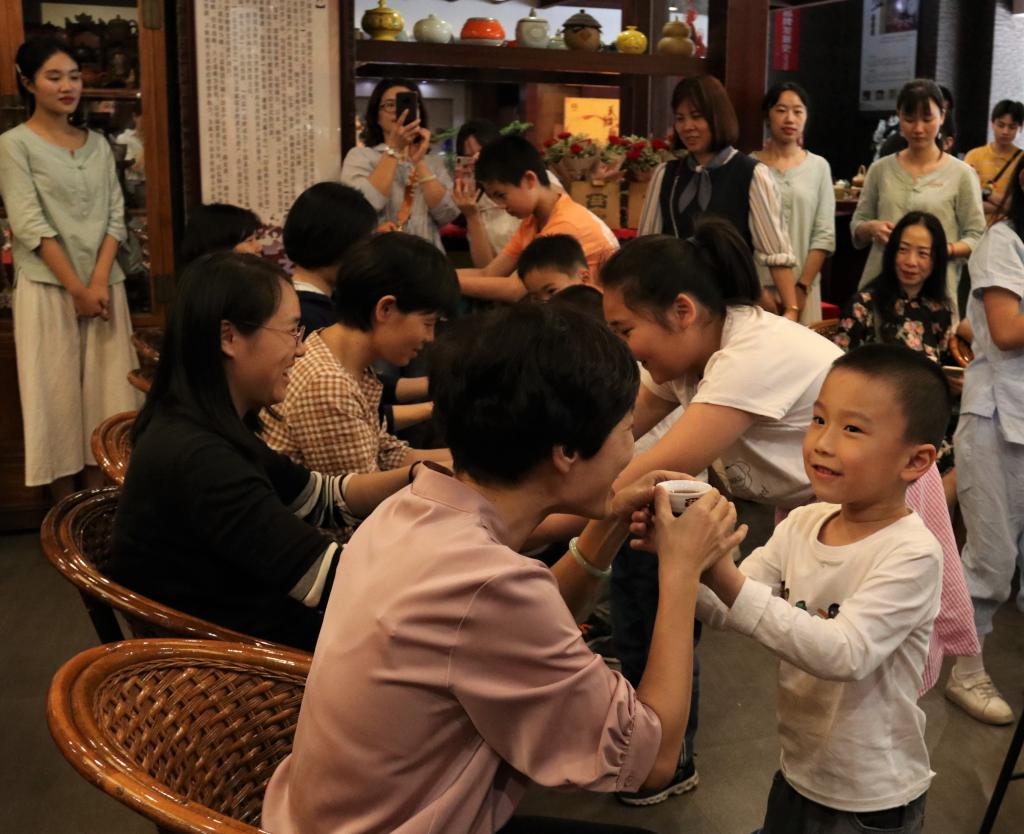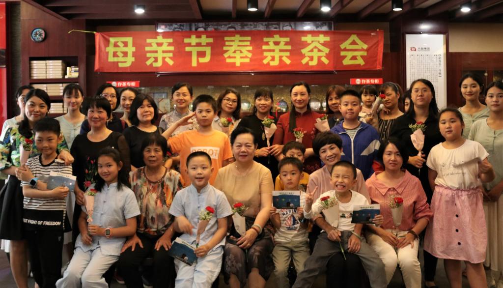看着红浓的茶汤从精致的茶壶斟至月光白瓷的品茗杯中,温暖浓情…太阳成城集团tyc234cc“朗朗读书班”的少儿们围坐嬉笑,迫不及待地端起茶杯奉给亲爱的妈妈。“举杯齐眉高,弯腰鞠真礼”,小茶人在云水茶协成员的指导下专注地投入奉亲仪式,递出祝福,传出真爱。